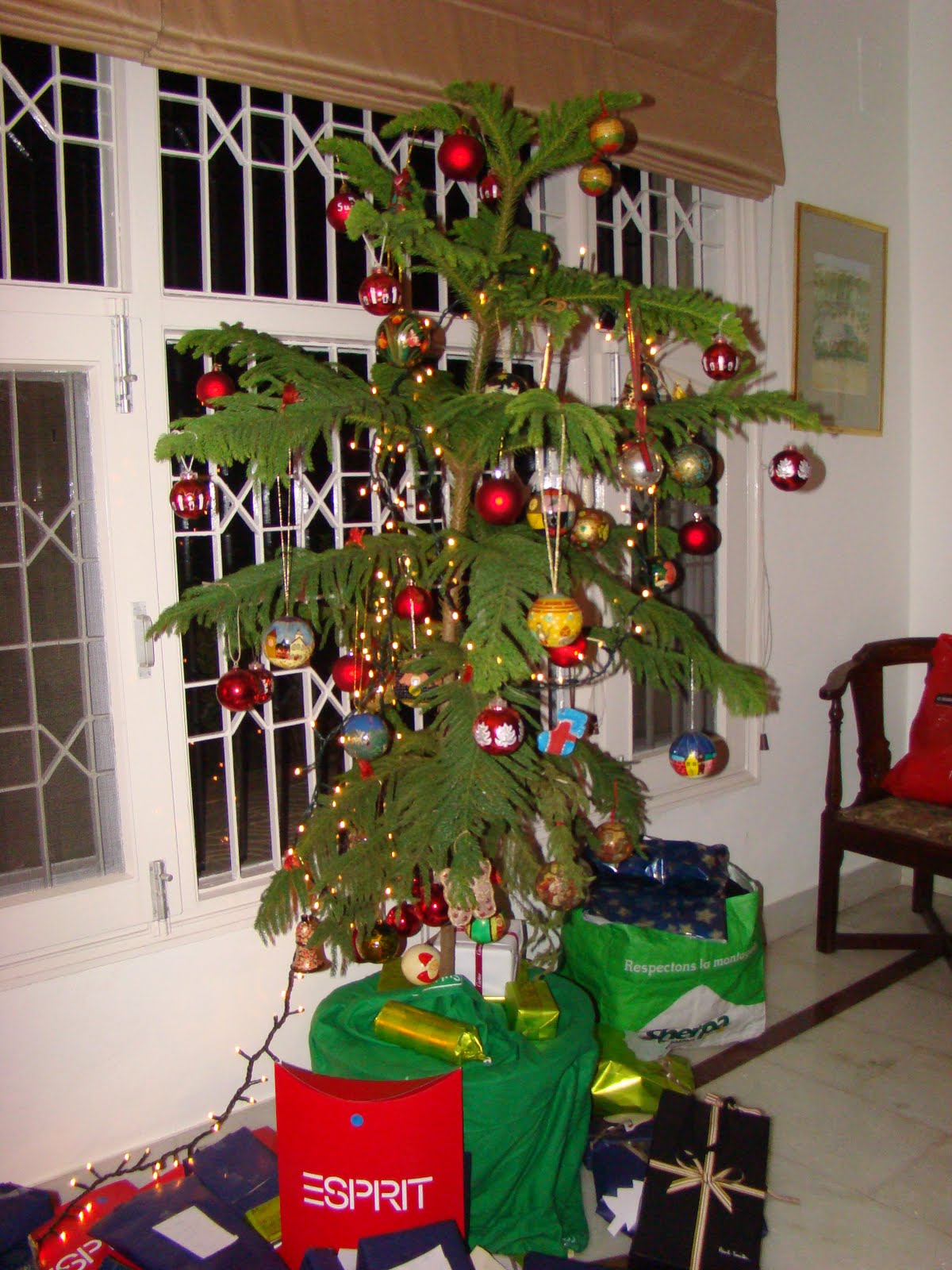 Well we have wrapped presents and put them under a tree. The tree was a quest in itself as I was determined not to succumb to an artificial tree but there were no farmed xmas trees to be had so I went to the closest nursery and bought a fir-looking tree in a pot which is a pathetic little thing but which can be used year in year out while we are here.
