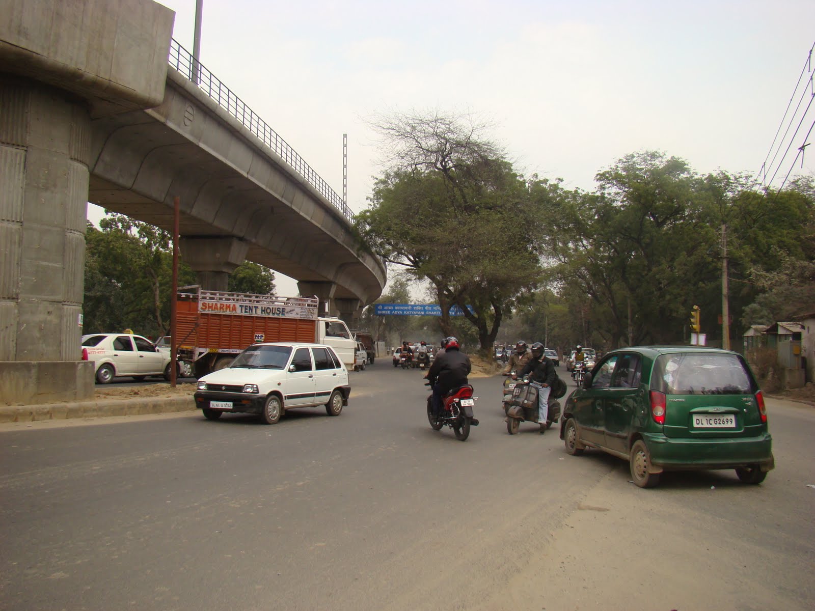 I made my plate of houmous and crudites, I chose a nice bottle of chilled sauvignon blanc, placed the houmous on the floor of the car and the bottle on the seat and set off.The Guard looked bemused as I confidently drove out the gate and headed up the Mandi road. That is the easy bit. The problem is negotiating the junction onto the MG road which basically entails crossing a congested two lane mad Indian highway straight across to get into the lane towards Delhi.Typical Delhi junction, highly dangerous, totally mad and very crowded even on Sunday.