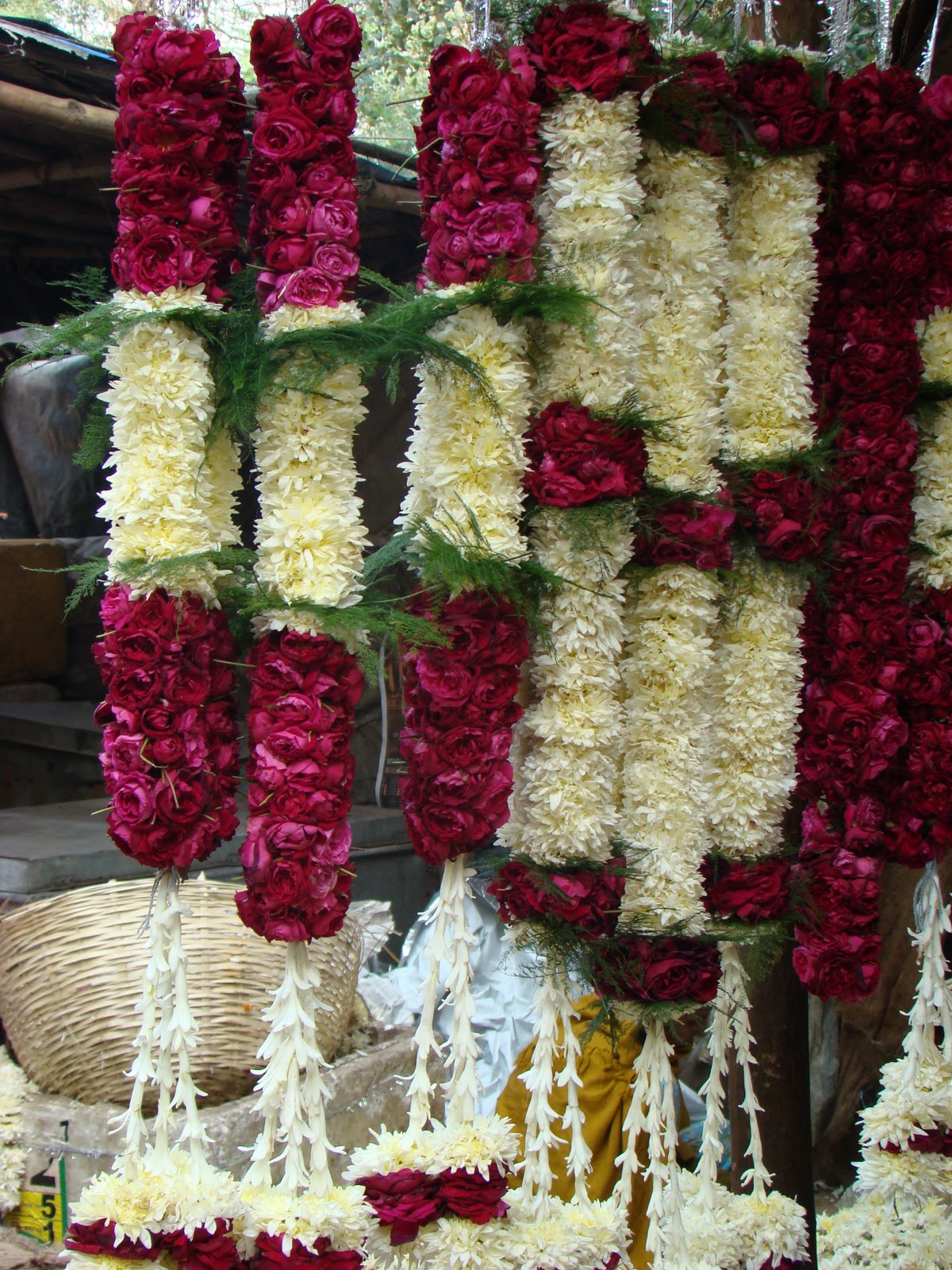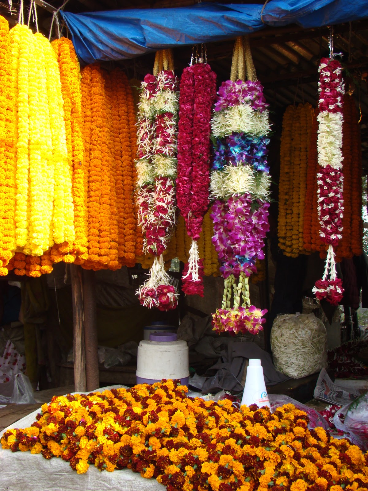 We took a walk there a few days ago with Ben and Alice who are visiting and while I may have blogged about the market before seeing it during wedding season was quite amazing. The amount of flowers being weighed and sold, the nimble fingers beavering away and the thousands of garlands on display were just a feast for the eyes. This blog is for Ben and Alice bright and observant onlookers of the world, who are just completing a round the world trip which took them to California, Fiji, New Zealand and Borneo among other places.It was lovely to see you and spend time with you and may your future be flower full and fragrant.