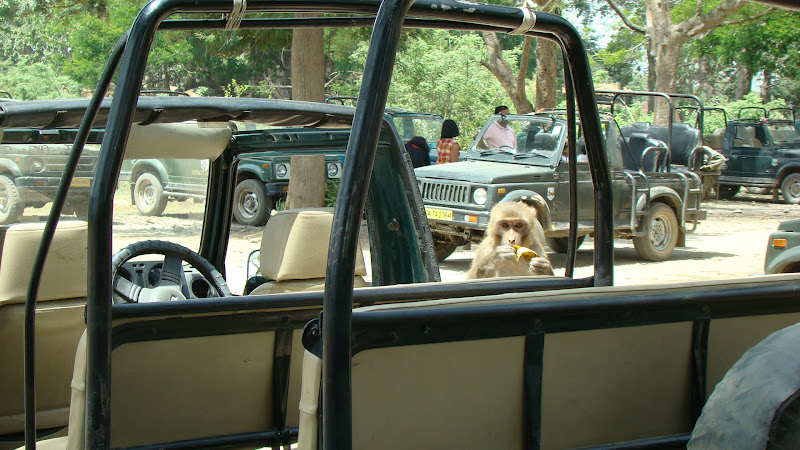 We were driving along in the coolness of the sal when C said he thought he spotted a tiger crossing the path. We sped up to where he thought he saw it, but there was nothing to see but dense undergrowth. No sooner had we set off then the alarm calls from the barking deer were heard coming anxiously and frequently. So there was no doubt there was a tiger- the only question was where ??