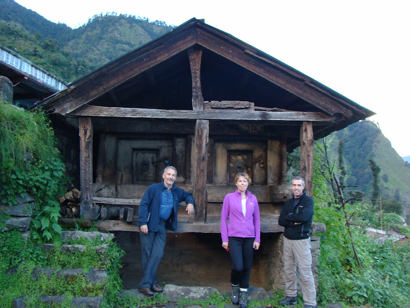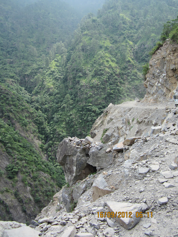 We were four ;two doctors, one well equipped, an actuary, whose job it is to assess risks but who secretly wants to be Ray Mears, and I, middle aged and momentarily swayed by the attractive itinerary. It was too late to back out, friends flew in from Liverpool in the UK, we took the overnight to Dehradun and jumped into the waiting 4X4 which took us safely but precariously on a six hour journey to our starting point. The road was reasonable to Mussorie and then it became a morass of tight U bends, narrow, with cavernous drops, breathtaking brimming rivers and landslides where the recent heavy monsoon had unstuck huge boulders of rock as if they were putty. Everywhere along the way debris and the destruction were evident and none more so then in a little village where the force of the water had taken buildings,cars and human lives.