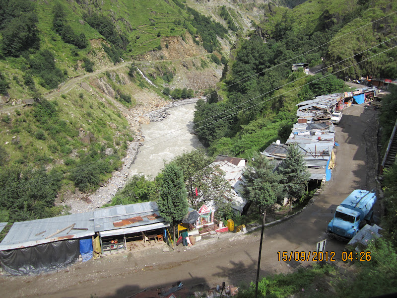 The afternoon, our final walk was meant to be a lighter version of all the above but actually I was no longer expecting anything better – my feet are sore from all the downhill and the paths of stone are jarring and uneven. We walked solidly for perhaps three and a half hours and turned back to look at how far we had come down the mountain.Very far !The last bit was on tarmac as we rounded a flowing river and went to the little village of Ghangnani famous for its hot springs. That night – a bed in a hotel ( the tents being too wet for us to stay in ) and a dip in the hot springs which come out of the mountain  burning hot. So hot we couldn’t stay in it but unbelievably soothing on all those aching muscles. Our first wash in seven days.