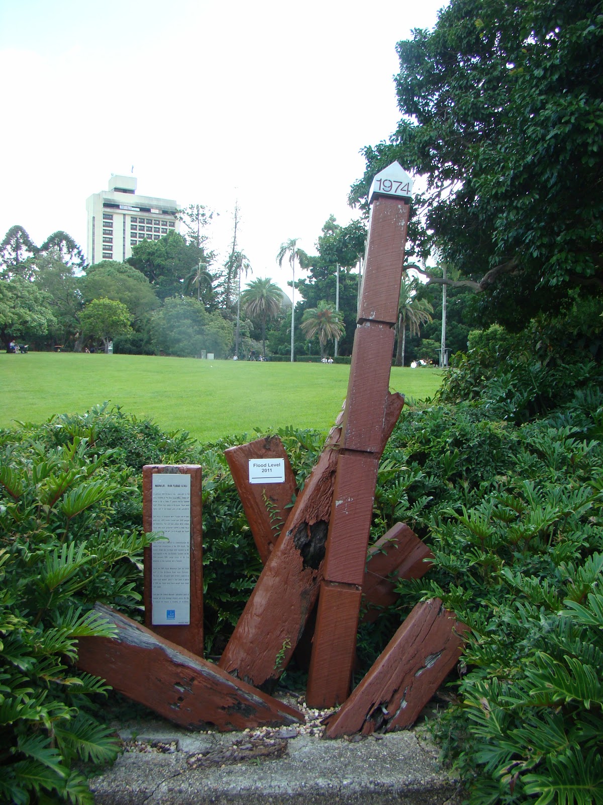 It is worth noting that there were devastating floods in 1890, 1893, 1897 and 1974. The more recent ones in 2011 is the level on the small white sign you can see in the picture. This is because Brisbane is built in a flood plain and these floods are likely to recur but the city has become better prepared to deal with them.