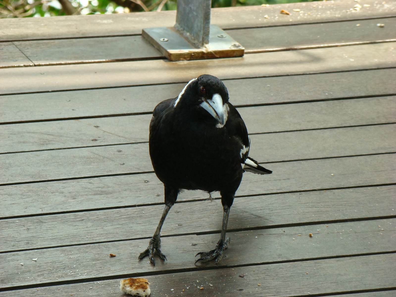 First up is Maggie the Magpie – I think she is female because her nape is greyish.These birds are notorious here for being quite aggressive when they have young and have been known to swoop down on you. So far I have never been attacked in this way, and I personally find the miner birds much more aggressive. So Maggie lives in a Bunya Pine in our valley – we see her perched – and then she swoops down to the deck and is happily fed on bread and bits of potato. She seems quite tame and will take things out of your hand.