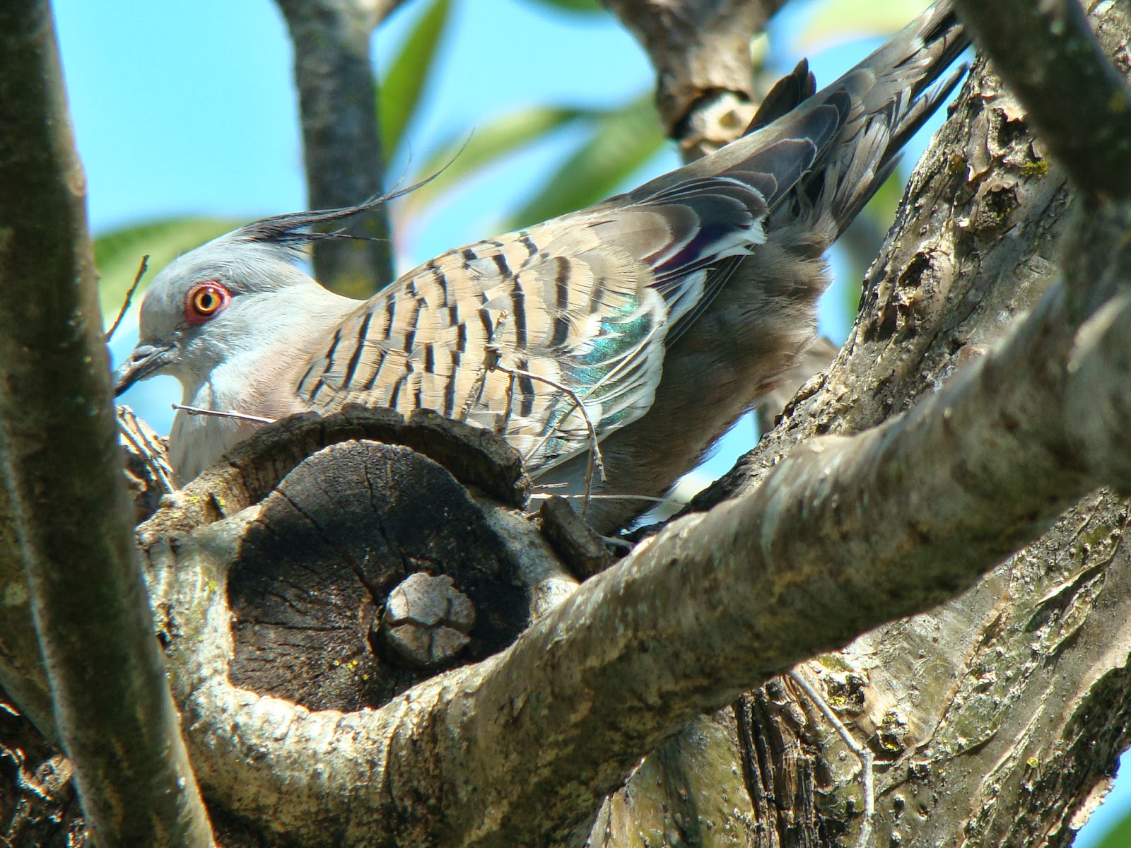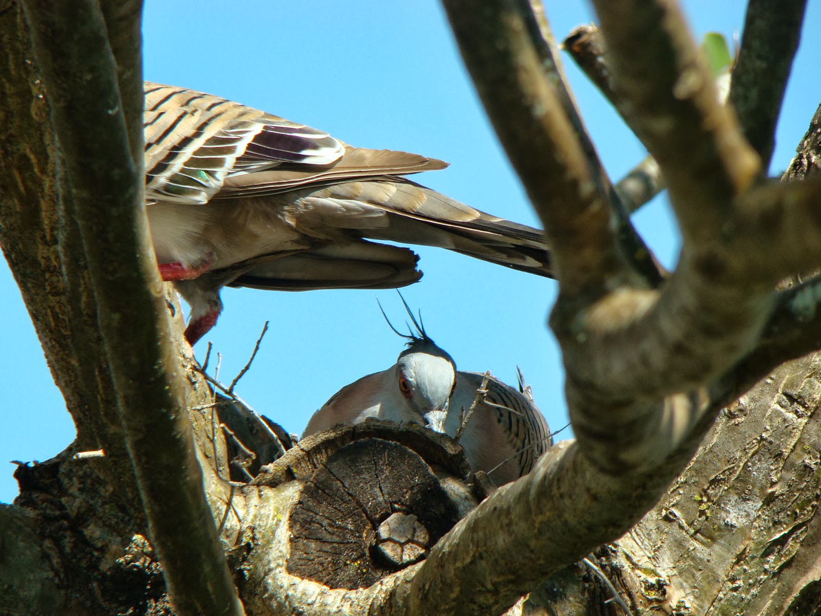 In the front garden are the crested pigeons, Paul and Pam who have been fascinating to watch as they build their nest in the blossoming frangipani tree. The female sits on the newly built nest and the male who has these beautiful mauve and green tips, goes off and finds twigs. He then comes back and literally walks on her to deliver the twig to her mouth and she spends hours arranging it just so in her new nest. Today they were doing a mating dance in the street with their tail feathers up strutting their stuff. So babies soon we hope.