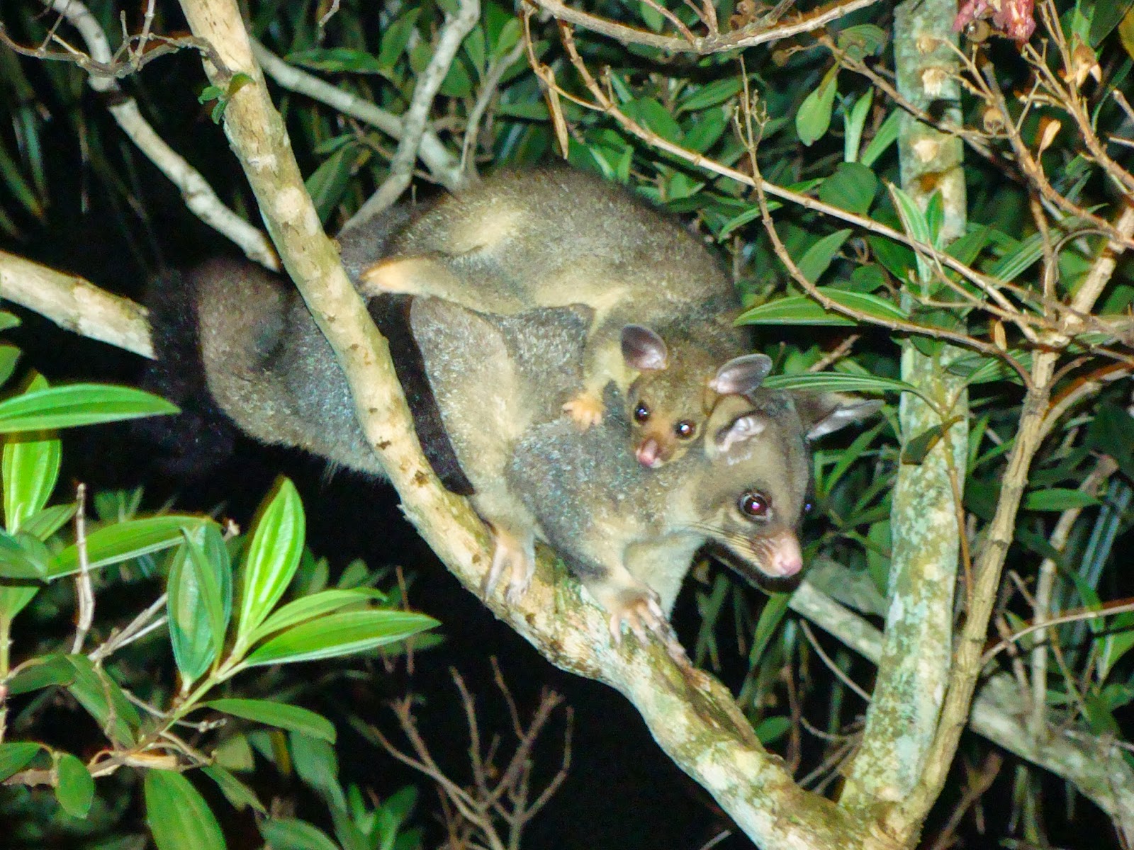 I didn’t think I was going to be able to capture the Possum and the baby so soon but here they are – they appeared last night, checking us out. The baby was clinging on to mummy and was happy to be riding along. The rainbow lorikeets took a stop in the tree and munched on the seeds.