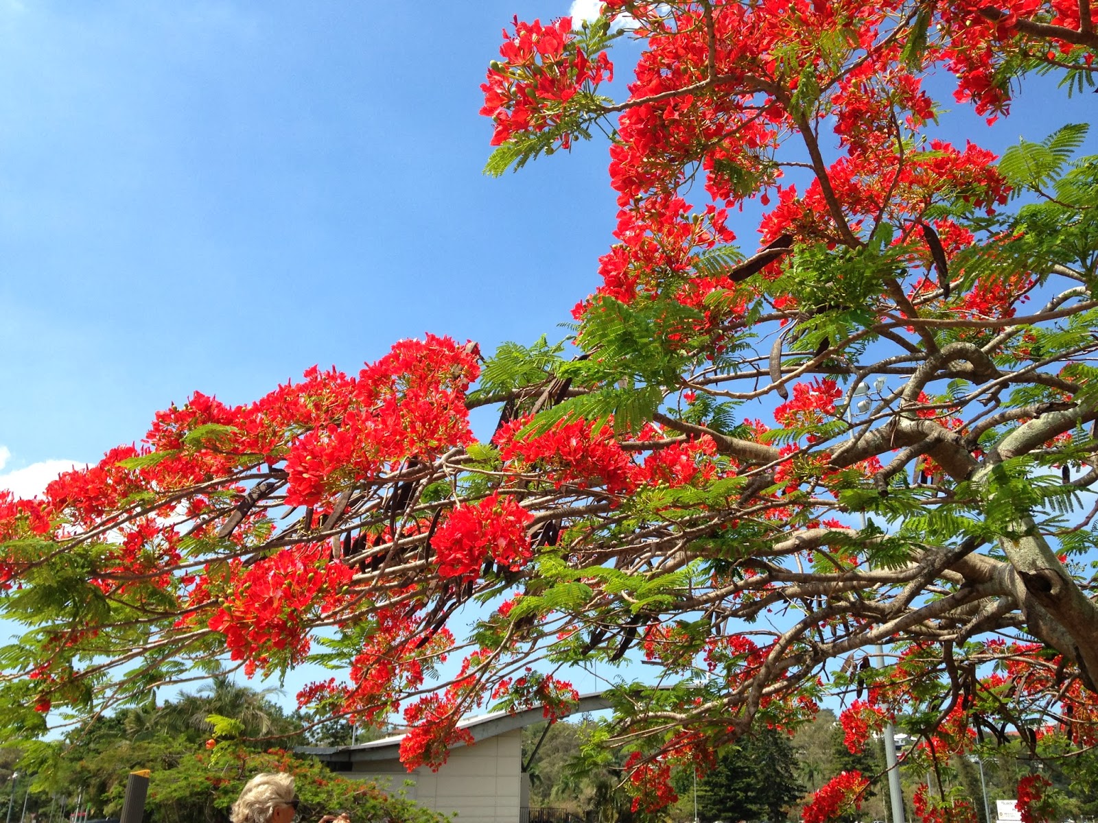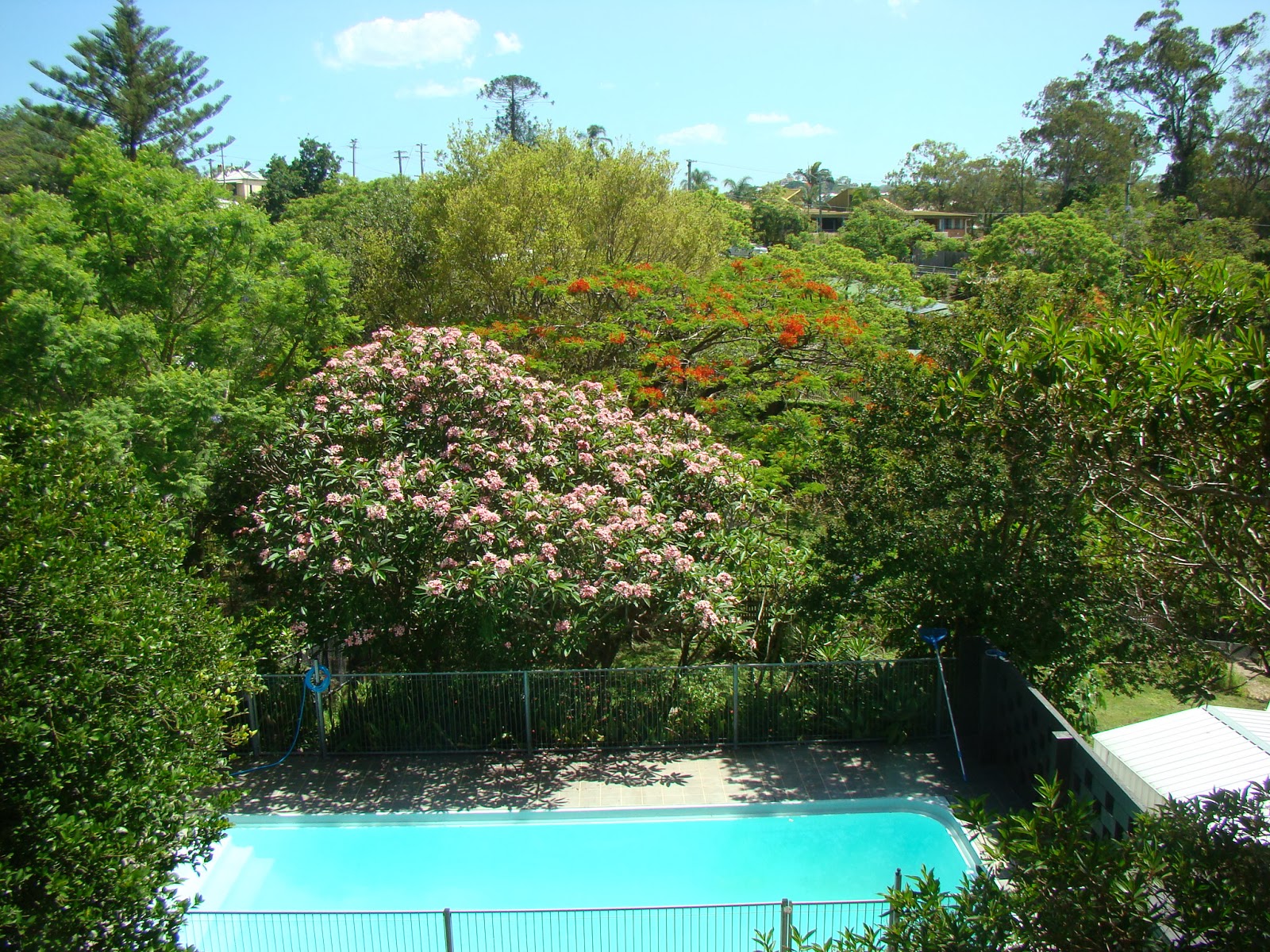 And the view from my deck with a pink flowering frangipani in the foreground and the Poinsiana coming out behind.