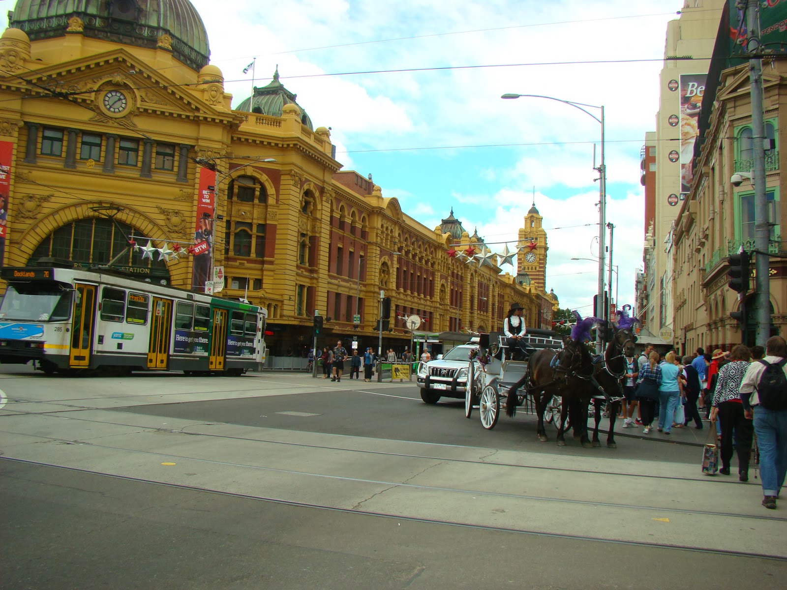The iconic trams on Flinders street with the horse drawn carriages taking tourists.
