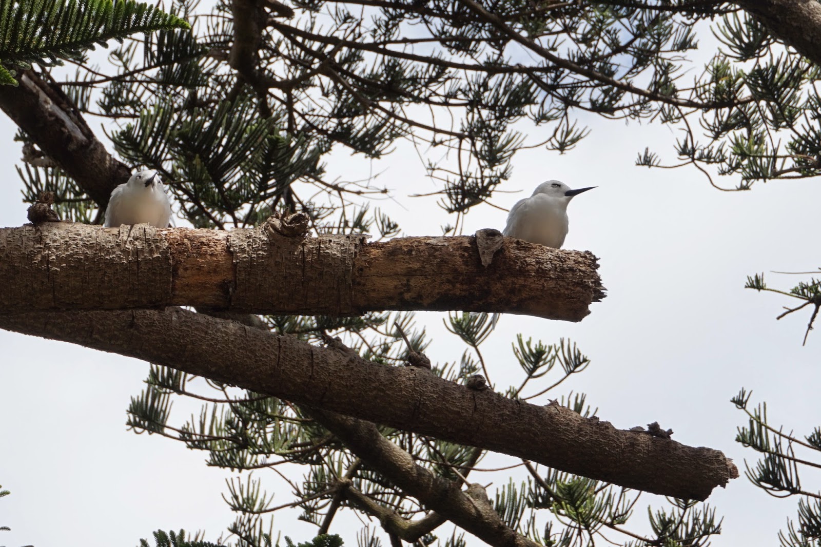 They have a blog post all of their own, they were so plentiful and colourful on the island. They are sea birds and there are several types. The White Terns love the low branches of the Norfolk pines that grow tall and majestic on the island. They are easy to see along the road- sides on the branches.