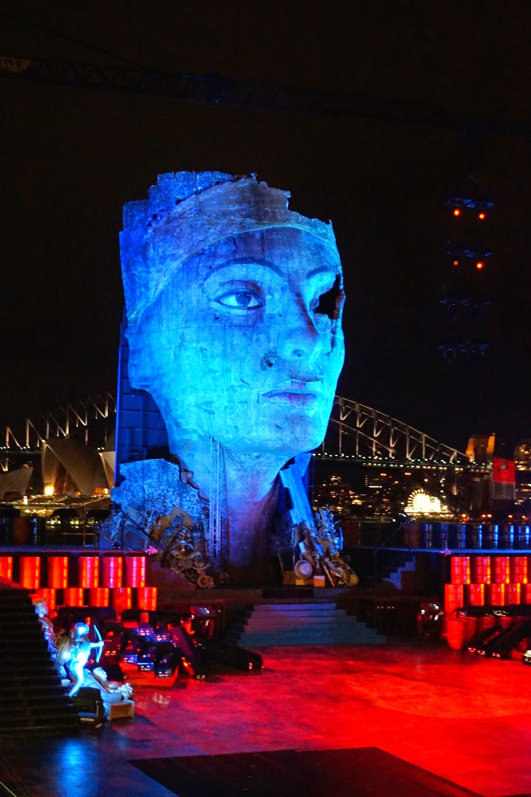 Over the weekend we watched Verdi’s opera AIDA which was set at the water’s edge, with a backdrop of Sydney Harbour Bridge and the Opera house. The setting, with a towering cast of Nefertiti was visually engaging. I enjoyed the music and the singing but I was very disappointed by all the rest. The costumes were bizarre and out of place, some of the casting was dubious, and the design of the set and the way the opera unfolded just didn’t seem to work at all. It is not often that I am disappointed on this continent but this was one of the occasions. However I am sure you will enjoy seeing the lovely cast of Nefertiti which was the backdrop for the opera.