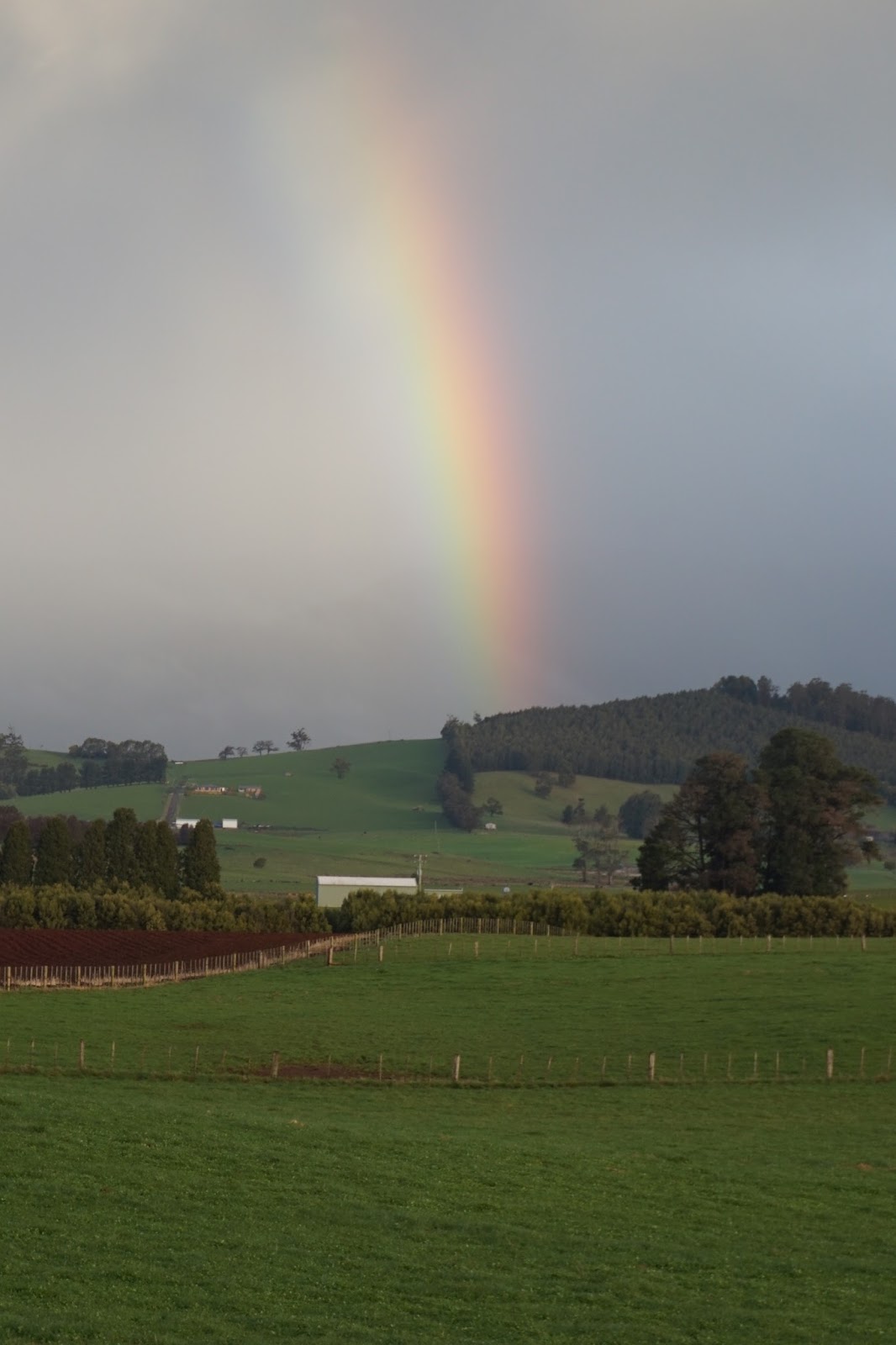 The rainbow coming at the end of our day, the rain having abated and the sun creeping out of the clouds. We stopped the car and took in the strength of those colours in picturesque countryside.