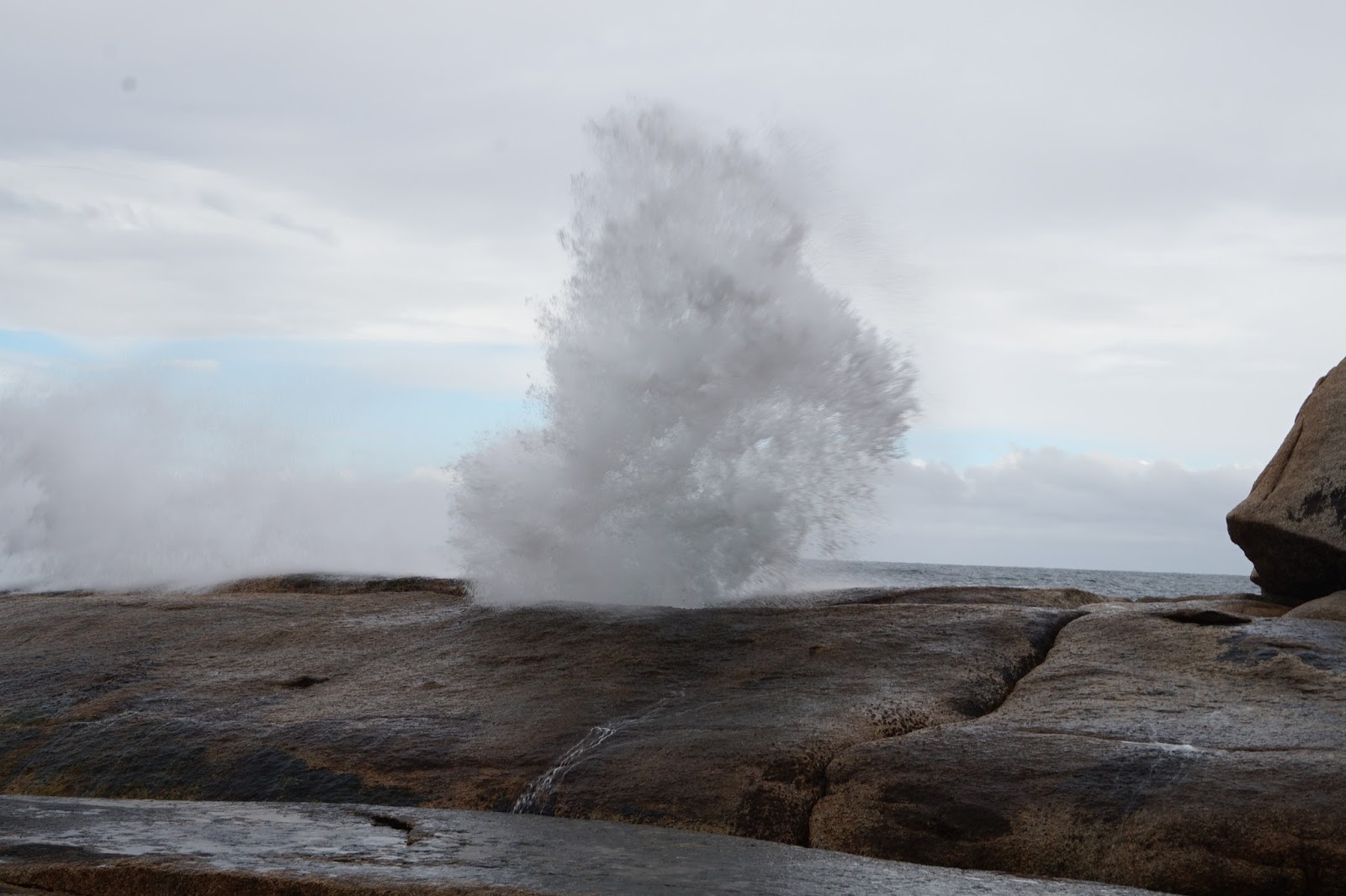 Travelling up the Eastern Coast of Tasmania the roads are empty and so are the beaches. The weather is still a little chilly but the sun is in and out of clouds and the light is a joy for any camera lens. We stopped at Bicheno, a small town which is famous for its Blowhole. If you are wondering what this is, here is the answer. A spray of white foam which is forced up through huge rocks on the beach.