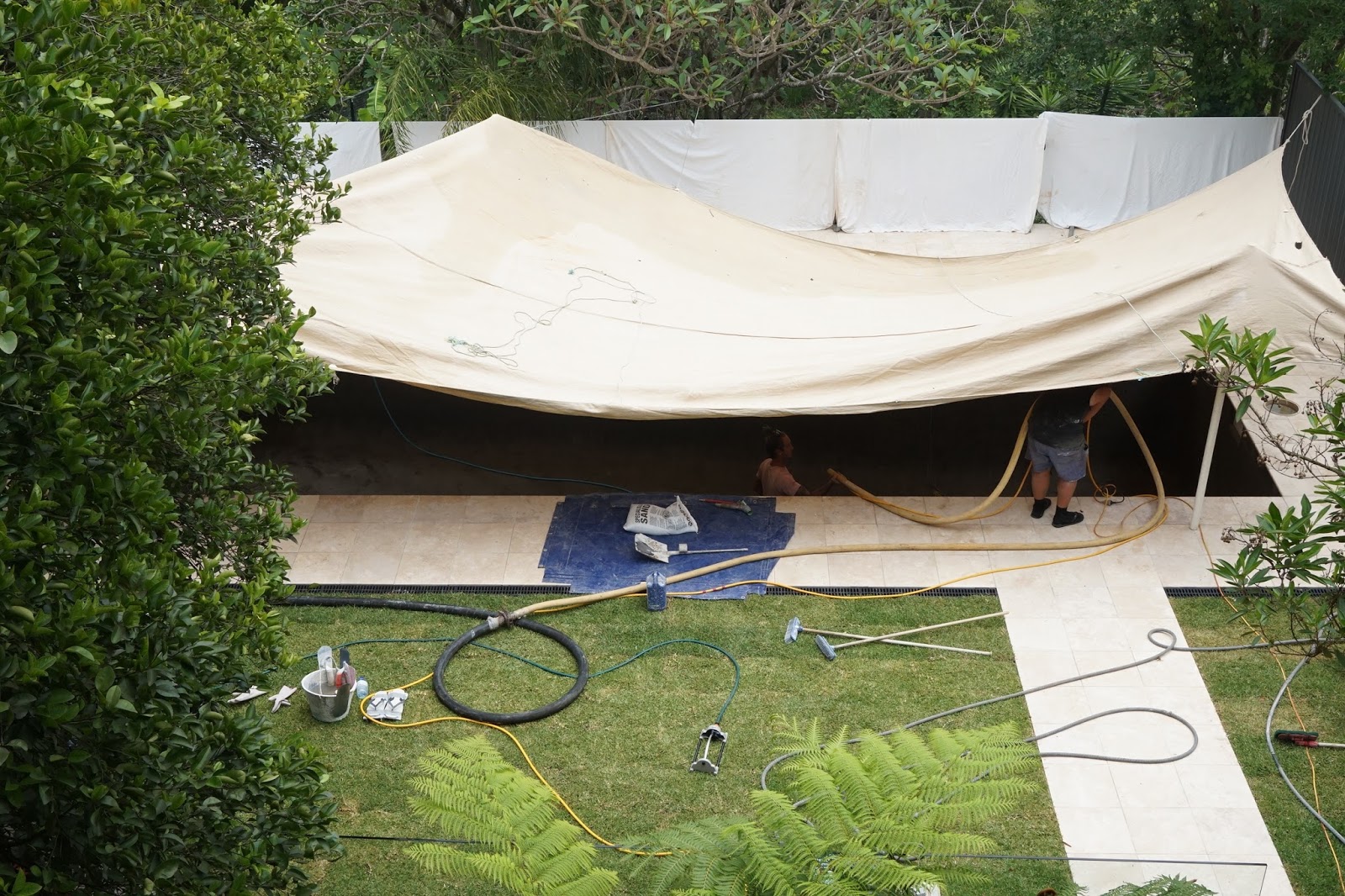 The most unbelievable team of young guns came to pebble crete the pool. A thin layer of concrete with small pebbles which creates a non slip surface for the pool. These are new terms that I have learnt. The truck was immense, the operation large and it involved extending pipe work down to the pool, pumping the pebble crete and then working under shade and very fast. I felt I was in some science fiction movie with creatures about to emerge from the depths of the pool.