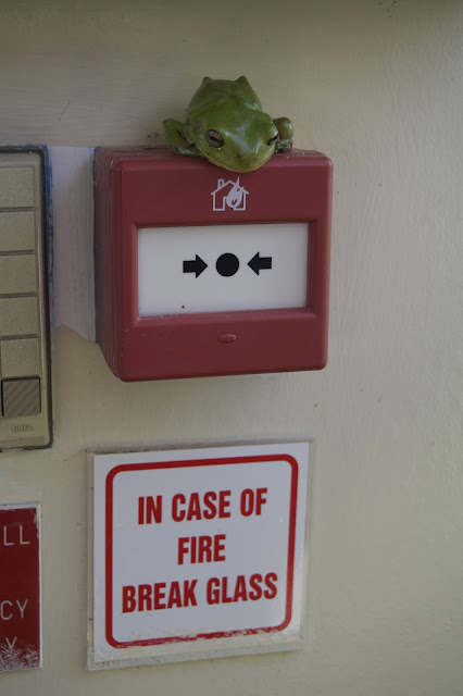 This green frog seemed as if he was a porcelain fixture for fun atop the fire alarm button, but on closer look we could see he was breathing and very alive.