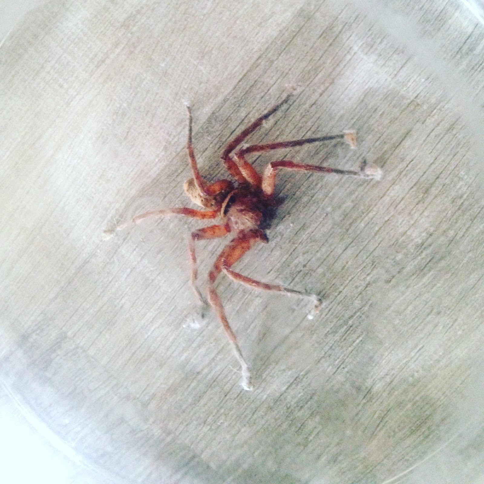 Except this one wasn’t climbing up the spout so much as strolling on my floors. Now he was not as incy wincy as my brain would like him to be and when I saw him I stopped in my tracks. I went and got a pyrex dish and placed it strategically on top.