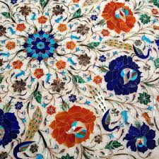 Walking along the pavement on a Sunday morning I came across this which for reasons unknown moved me greatly. To start with I wasn’t sure what I had seen, so I bent down to get a better look and there firmly embedded in the pavement was a “fossil” flower. Yes, I know, I have been watching too much Attenborough, but isn’t this just delightful. It reminded me of the inlay work at the Taj Mahal and let me show you what I mean. You can see the light through it, the delicate fronds inside the flower which now lies on the a slab of concrete. Made my day.