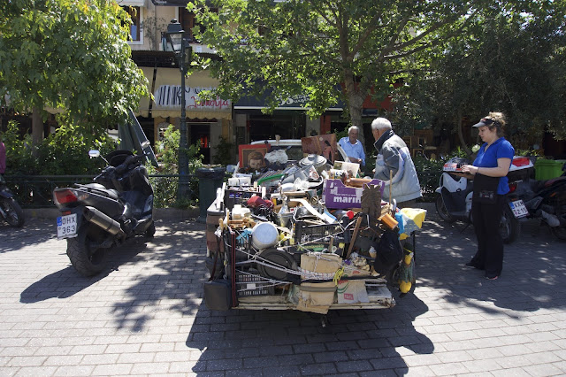 There may be some wonderful bargains to be found here and some lively Greeks who will enjoy the bartering as an exercise that needs to be won. Some of the bits of furniture I suspect come from old grand houses which have fallen on hard times. There are homeless people and a fair amount begging on street corners. One lady was asking for help saying she had a sick husband. Hours later she was in exactly the same spot, plaintively asking for help. Most ignored her and carried on. I found it hard to listen to and bought her food and drink for her at least to have a break.I noticed there are more dogs – once treasured pets perhaps, who have now been abandoned.