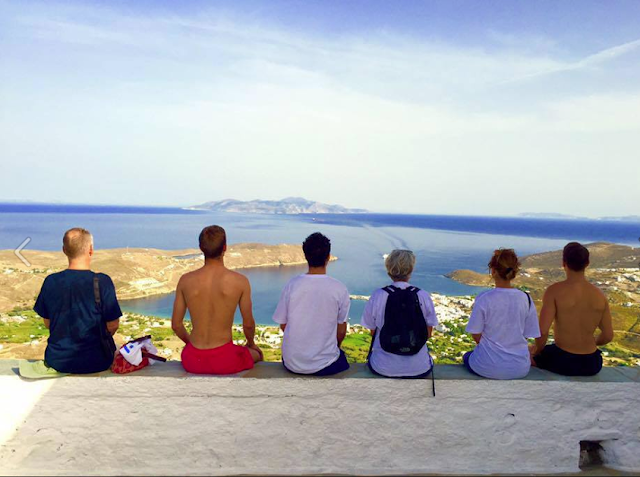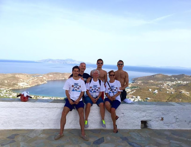 We counted the steps up to the top – 824 and there at the very top was a beautiful little church and a couple of young girls who were selling their hand-made bracelets. I immediately started chatting to the younger girl. She came from Albania at the age of one, but was now in a Greek school and speaking fluent Greek. She was clearly very bright and lovely to talk to and she took this stunning picture of us all. Her name is Katina.