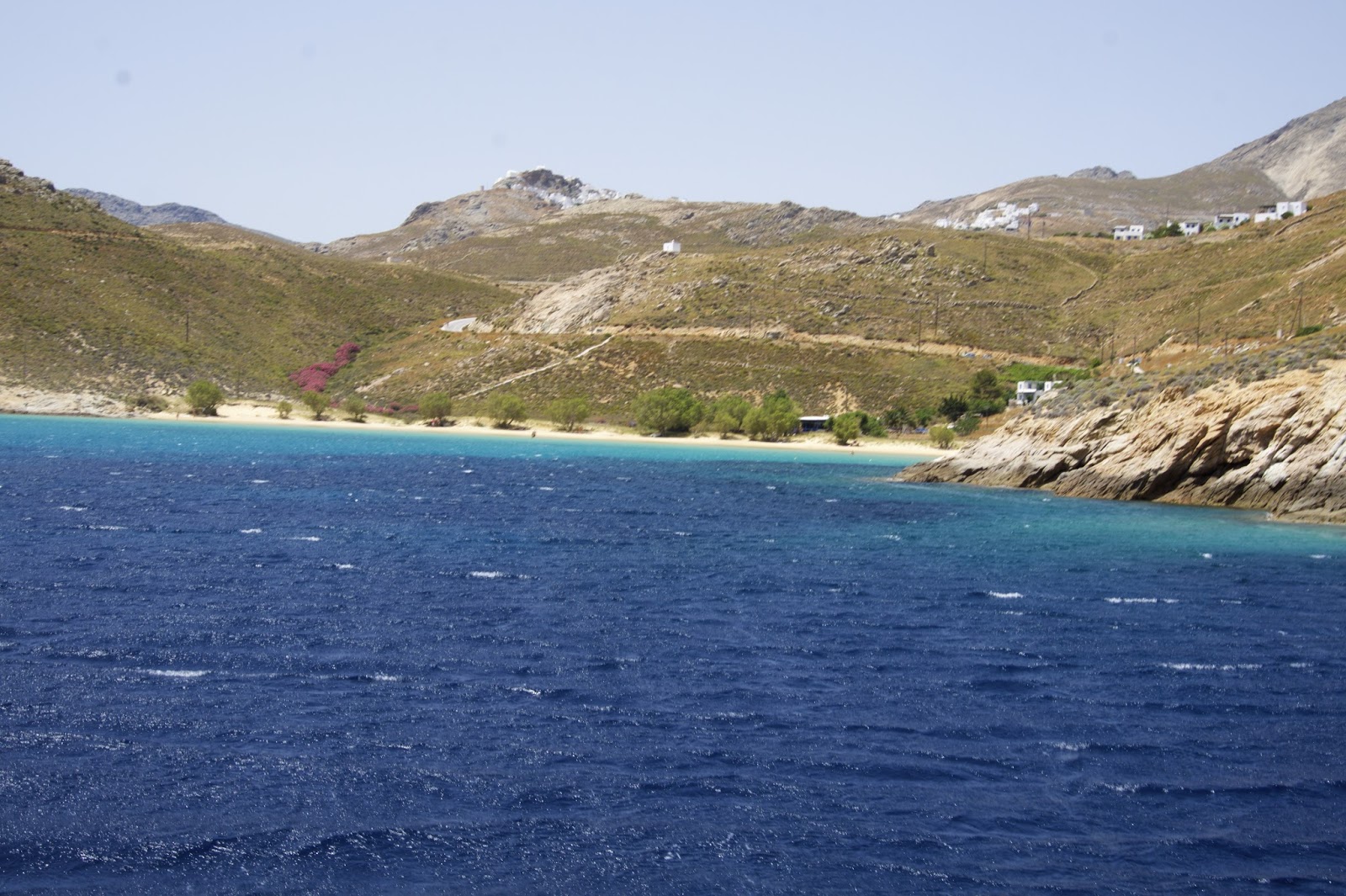 We left Kythnos and headed for Serifos. The wind had picked up considerably and I feared rough seas. You can see the wind on the water. We stopped at Psilli Ammos to swim, a beach that had been voted best European Beach some years ago. As the wind was up the water felt colder and we swam vigorously to get to the beach and a cave beyond. The boys headed to the beach and found a tree from which to do pull ups.