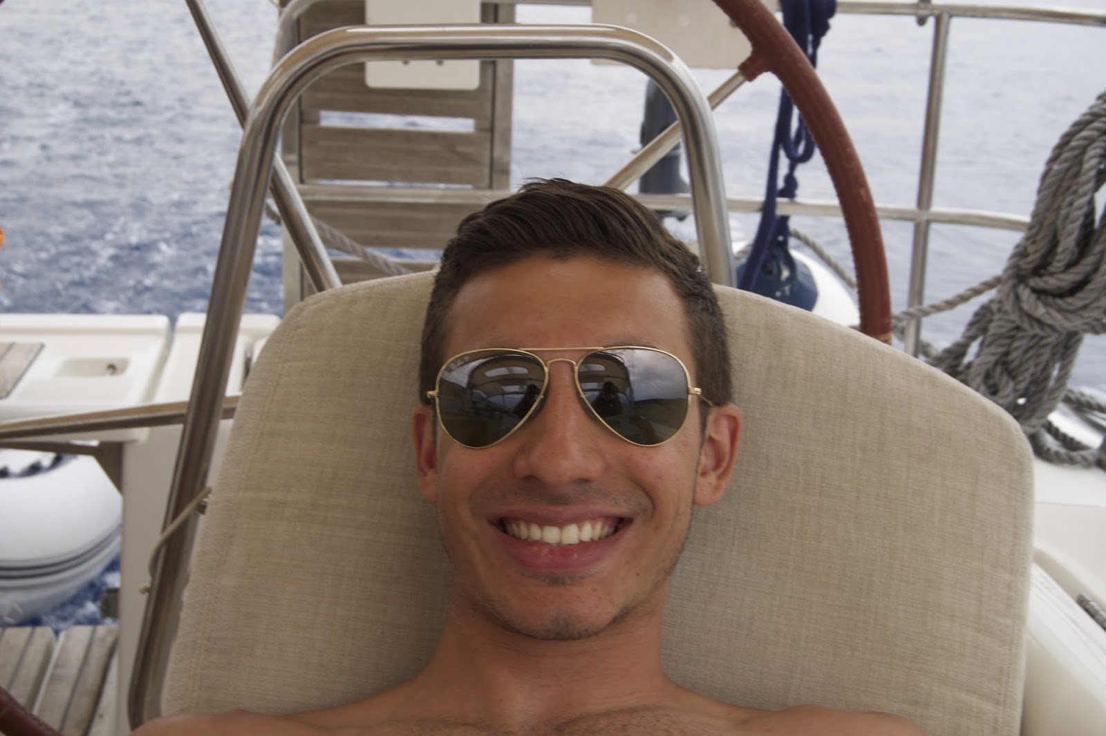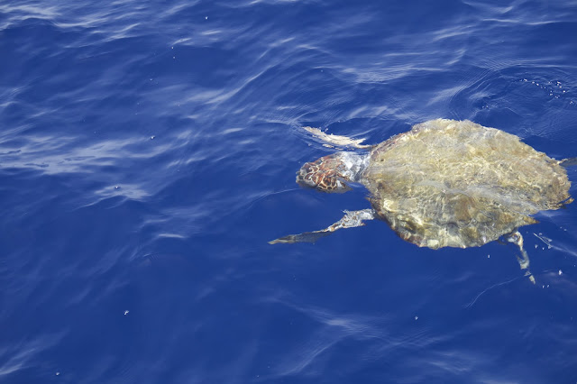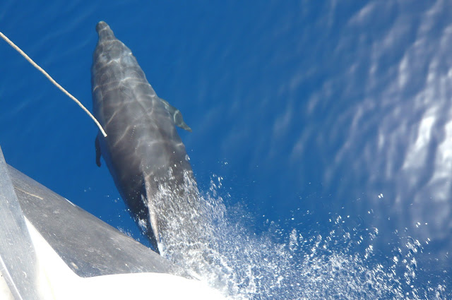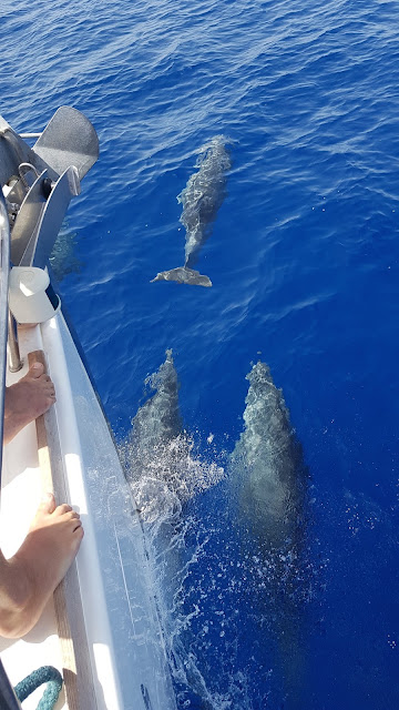 The sailing was great today but what was even more fabulous was finding a solitary dolphin along the way and then a pod of another four. They swam under the keel of the boat so close to the surface we could see every scratch mark on their backs, they responded to our enthusiastic calls, rolled over, looked up at us and you could swear they were smiling as much as we were grinning. They did rolls and flips, they jumped and splashed and when they had had enough they swam out and looked for new playmates. It was spectacular and fun and made doubly exciting when just a little way on we met a friendly turtle who was curious enough to stay afloat and swim with the boys.