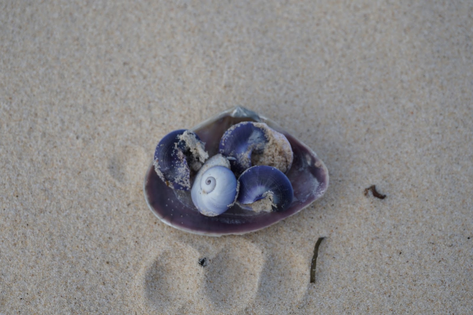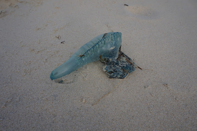 We took a walk along the beach almost as soon as we arrived and came across some very strange objects – blue, almost paper thin sacs of nothingness which we were washed up onto the beach. I now know that these are Blue Bottles or Pacific Man oWar which are not a single animal but a colony of four kinds of highly modified zooids which depend on one another to perform different functions. They are also hermaphrodites.They have a painful sting and what I didn’t know is that even when dead they can deliver a sting. We prodded them but actually stopped short of picking them up. Just as well. It seemed to me there was fine stitching on the top and wondered how nature did this.