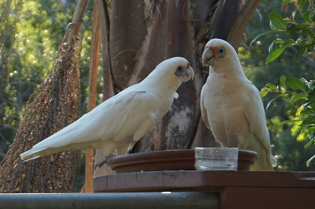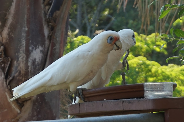 Following nicely on from my last post I walked out today and saw these birds which were not the usual sulphur crested cockatoos – well I was all a flutter – some new birds on the block. Aren’t they just lovely. Identifications welcome – a type of corella perhaps ?