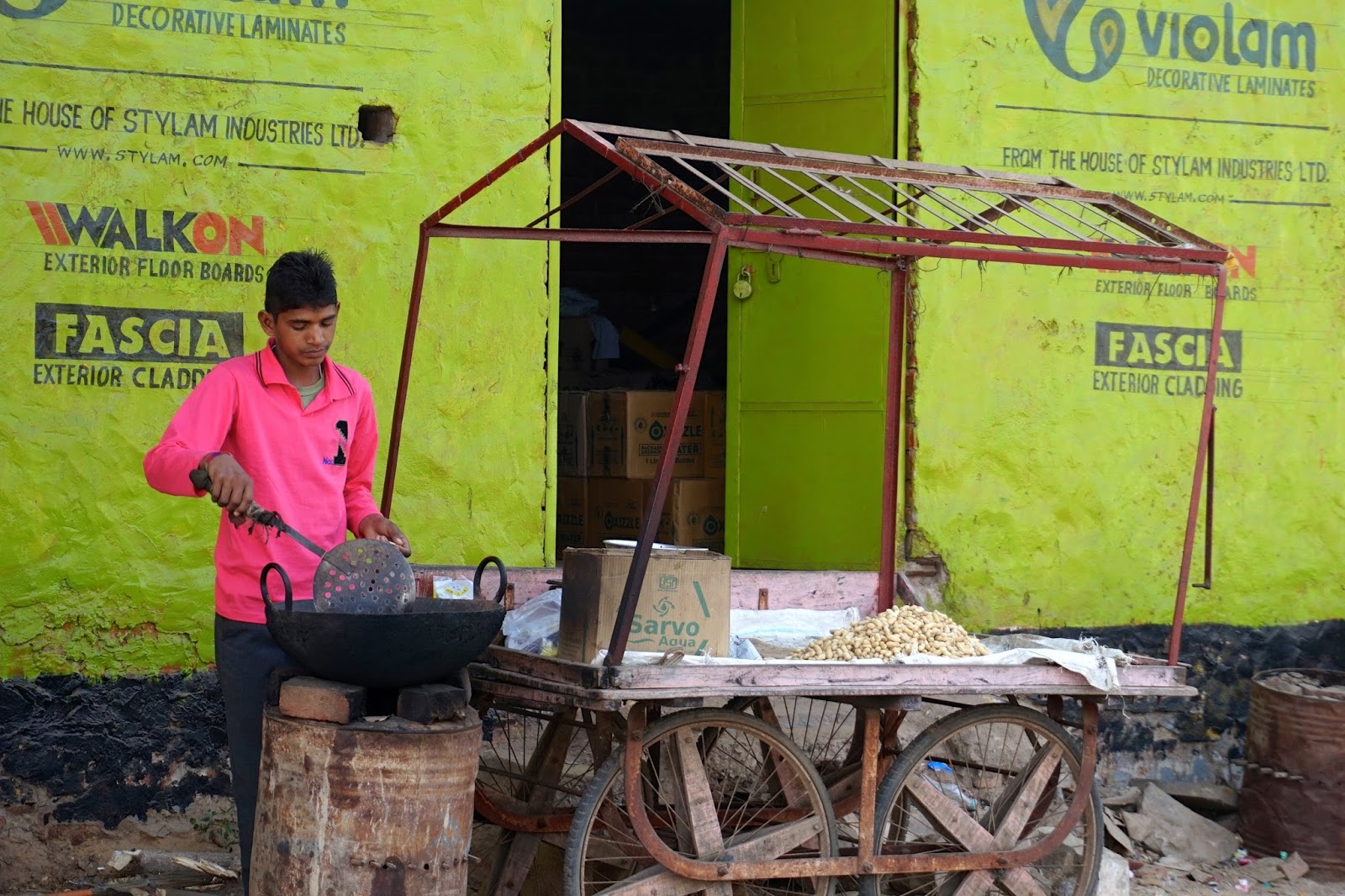 Just beyond, a girl in a red and orange sari rides side- saddle on the back of a motorbike texting – no hands holding anything other than her phone.
