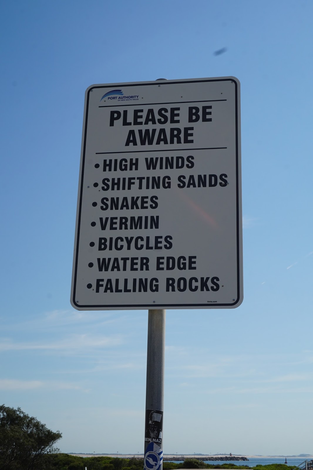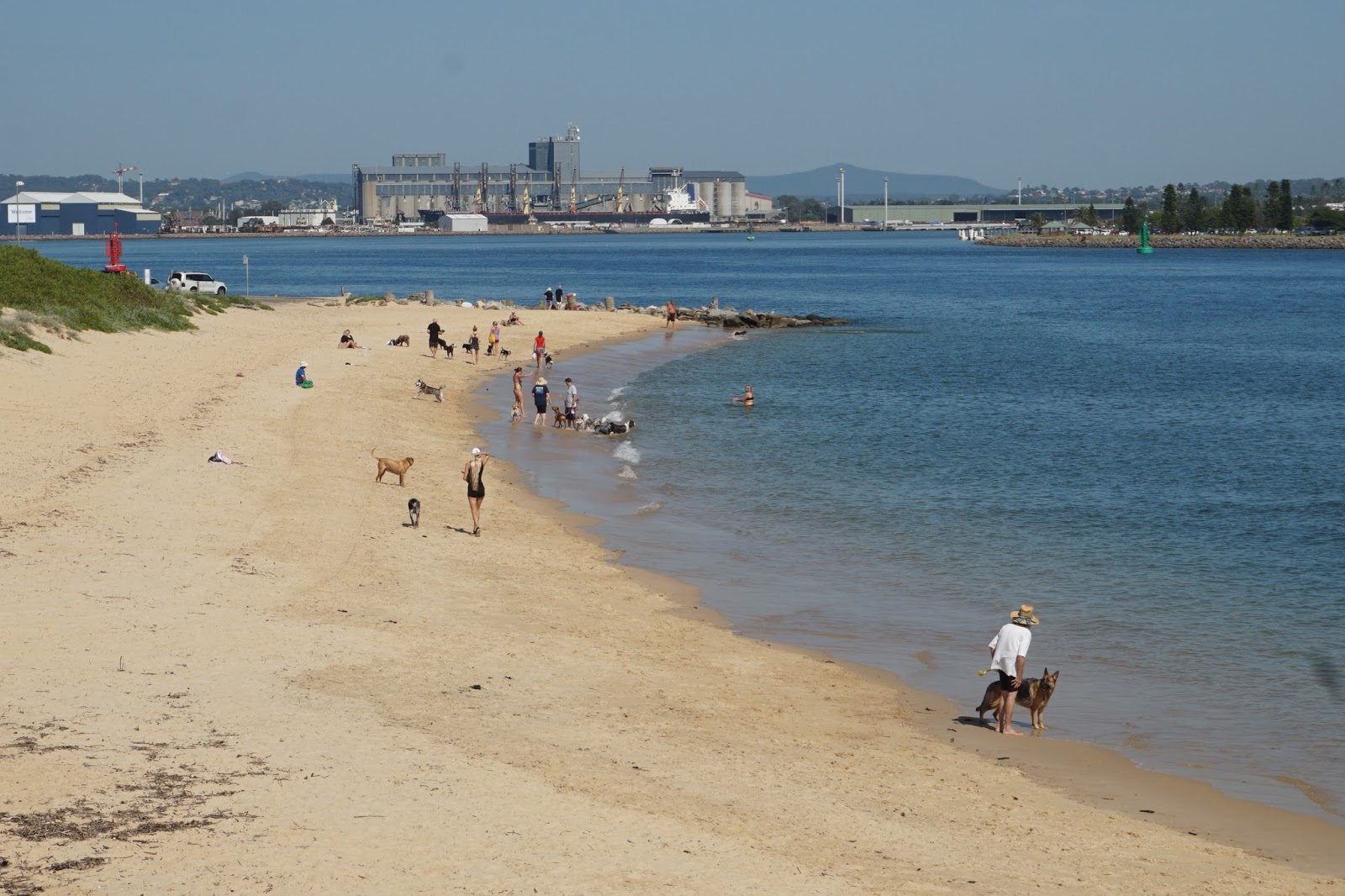 The industrial Newcastle in the distance and a doggie beach by the breakwater.