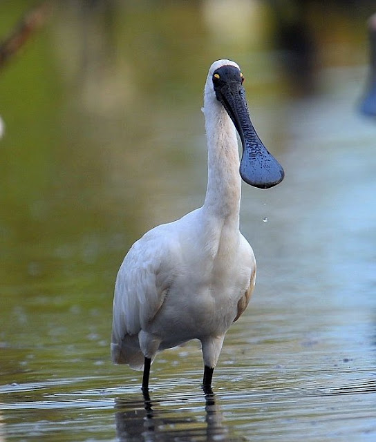 White, proud with a little white crest, two legs like liquorice sticks, feet which could be black stars and a glint of yellow in its eye, but best of all its kitchen implement- shoveler helping him eat.