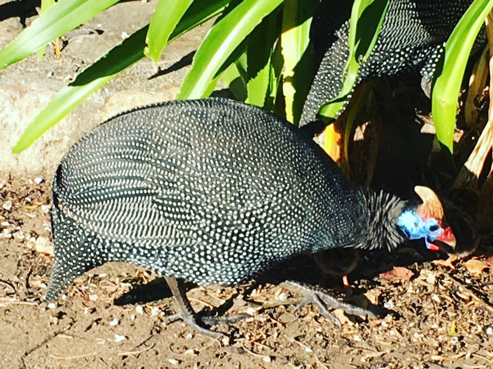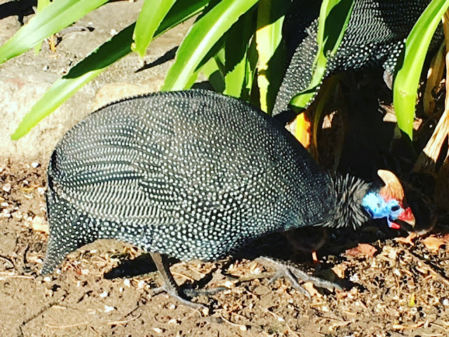 To the most delicately patterned guinea fowl with all its babies