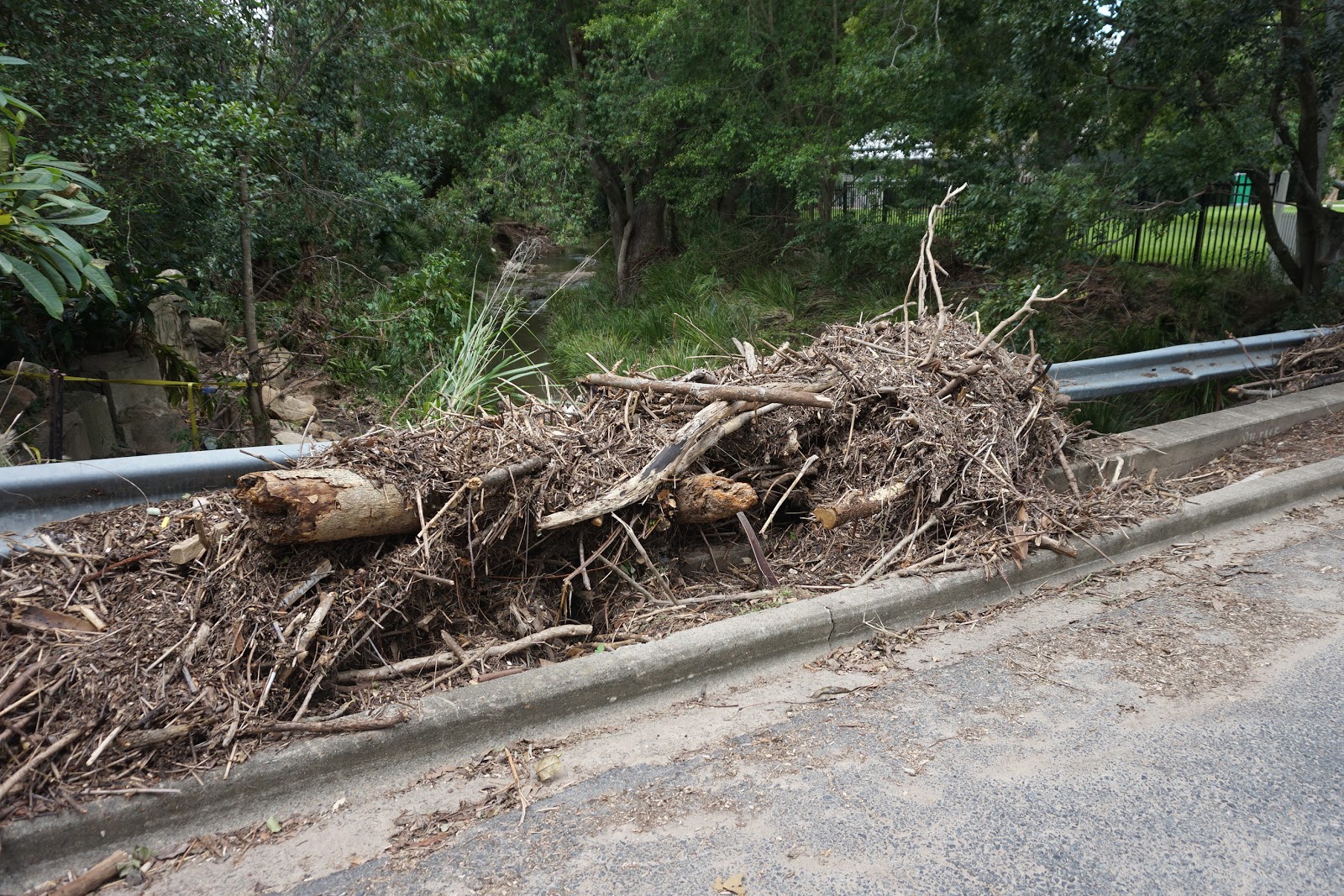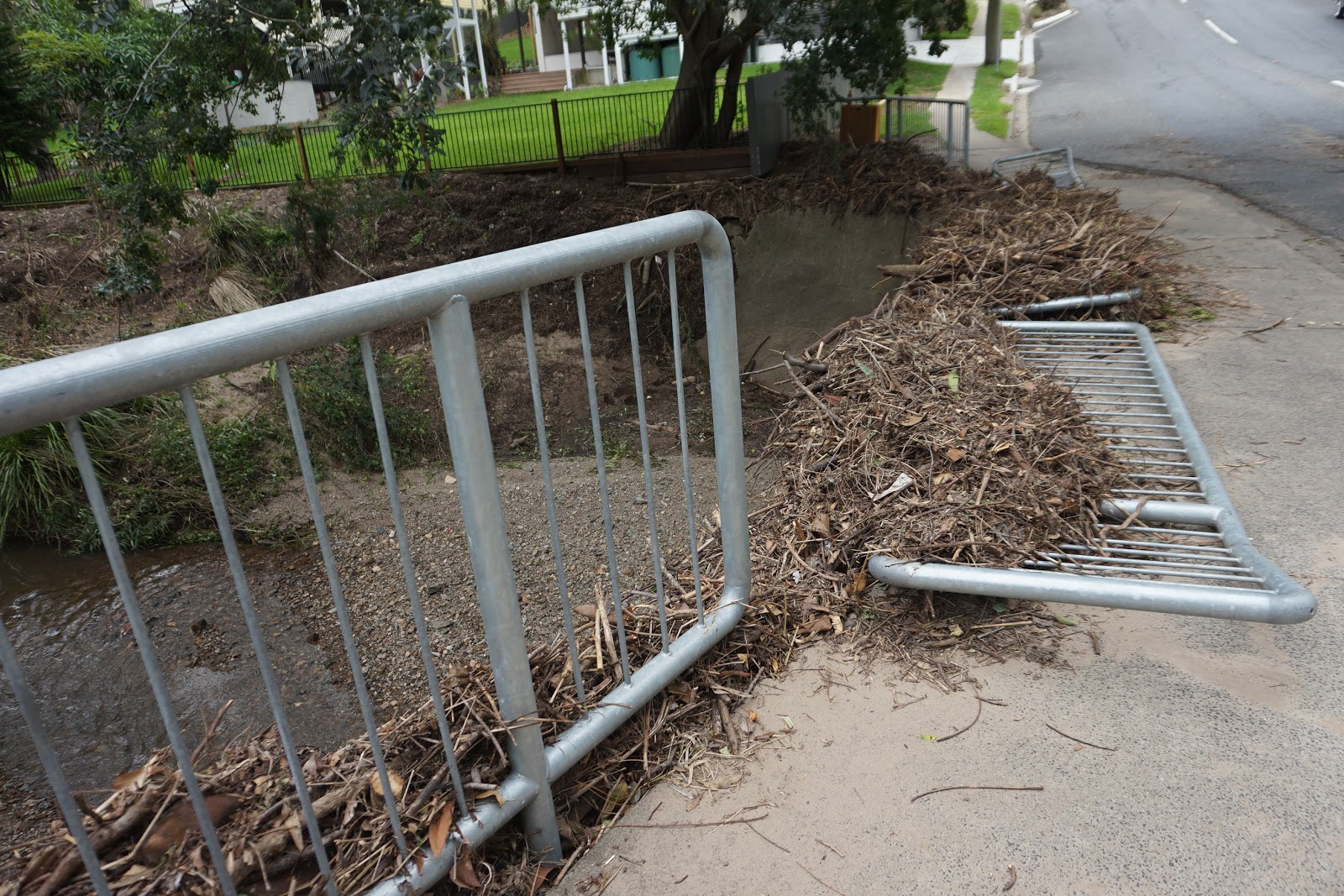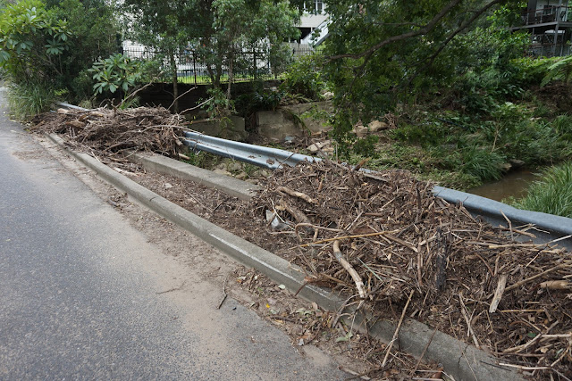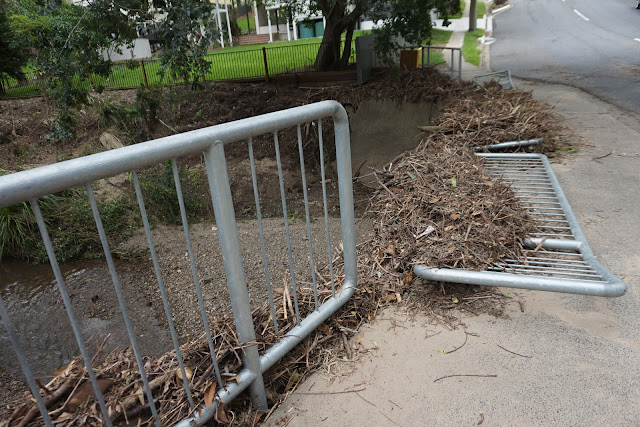 Sunday and the day started out cloudy but breezy. Perfect for a morning in the garden collecting the fallen branches, sweeping up the leaves, weeding and watching with joy the almost overnight growth of our passion fruit flowers after all the rain. Then it was time to take the neighbour’s dog for a walk and along the way, at the bridge, literally around the corner from the house, Debbie, in full force, knocking metal railings over and bending the metal guard everyone. Do you realise what force this shows and how wary we must be of it ? So few words today but a couple of pictures as a record of this local Debbie effect.