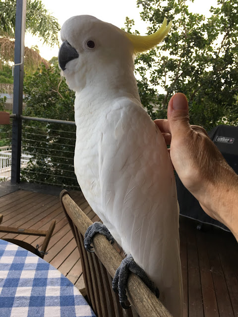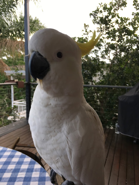 I was sitting on the deck, breathing in the scented air. The cockatoos had come and eaten their sunflower seeds and most of them had taken off. One stayed behind. We feed the birds and give them water but we don’t approach them. Today was different. This cockatoo approached me. I was sitting at the table and it alighted on the back of the chair next to me, then it made its way over as close to me as it could get. I started talking to it and I put my hand out. It turned to look at it and gently and carefully I started stroking its feathers on its back. We sat there in this state of togetherness for quite a while. I was so happy this had happened, I had made a new friend but truth be told I have no idea how to tell one cockatoo from another. A friend said the females have red circles around their eyes. This one was a girl if that is indeed a feature. I look upon it as befriending a whole species. Now that is a whole lot of new friends, all at once, which FB would be happy about.