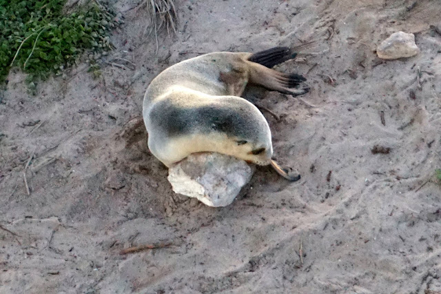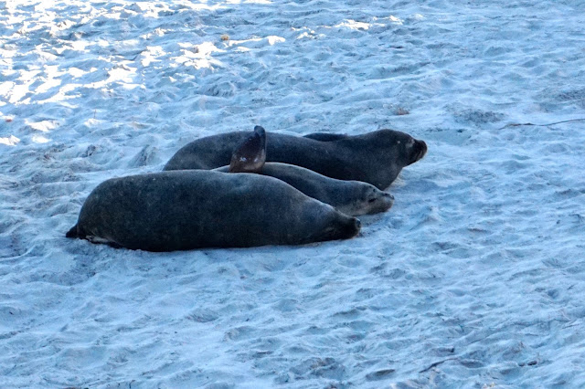Further down the coast is Seals Bay which is a sanctuary for the Australian Sea Lion which was so hunted in the 19th Century. Despite being protected now, their numbers are declining and there are only some 15000 left in the wild. The breeding cycle is long- 18 months, and there is quite a high seal pup mortality. These two males have sandwiched a female between them, perhaps in an effort to keep her warm and have fun later on.