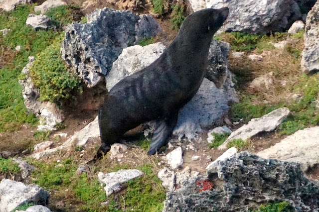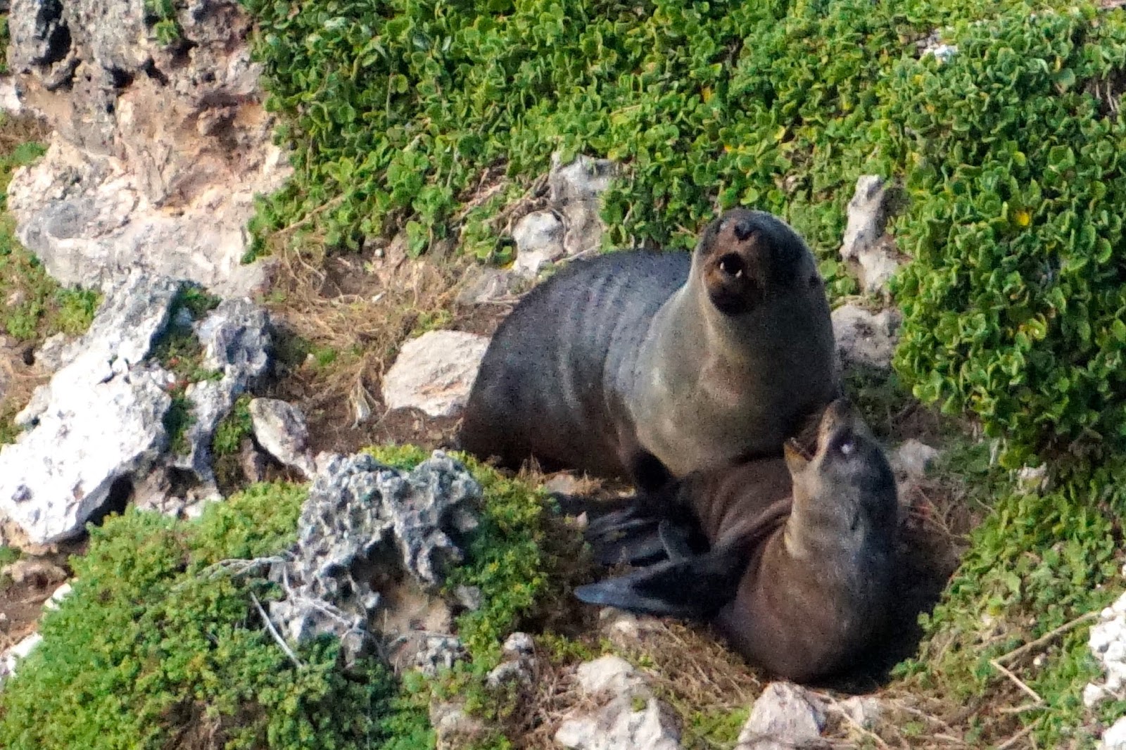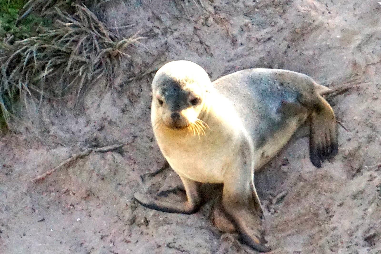 The New Zealand Fur Seals are found at Admiralty Arch, a cavern formed naturally by the wind and the southern ocean. They manage the turbulent waters and then climb up in an agile manner, quite surprising for their little flippers and rounded bodies, to greener areas, where they find a sunny spot and sleep like babies. They are smaller and darker than the sea lions, with long whiskers and external ears.