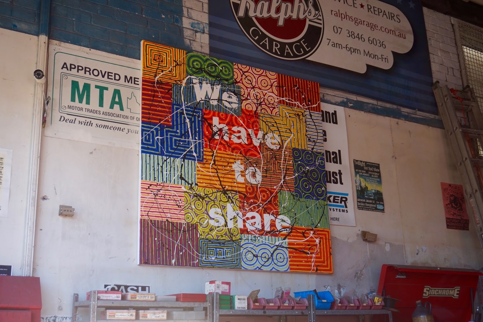 It made me think of an art work in Ralph’s Garage by Richard Bell that I had recently seen going on a guided ART walk in West End. The artist’s work introduced thoughts about indigenous people, dispossession, humans and animals and the pressures on the land. All we can do is share. That is only fair. Bats enjoy mandarins as much as I do. At times, you surprise even yourself at what things “poop” into your head.