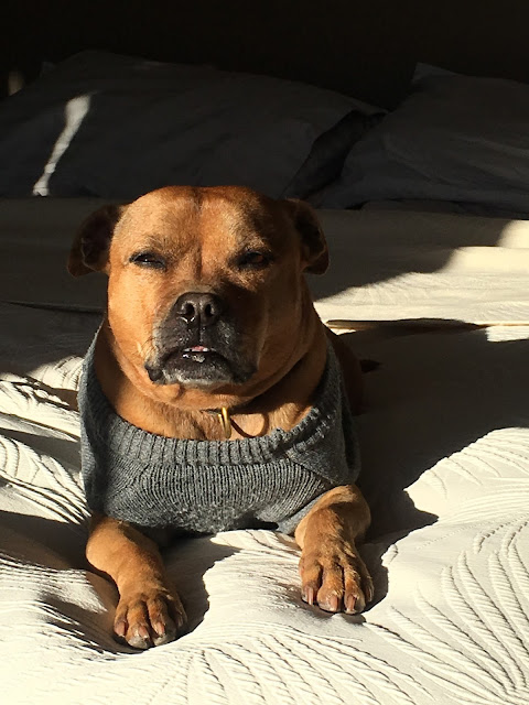 Just this weekend though I had an additional joy. Stella came to stay for one night as her humans were heading off to a party. She came with her bed and blanket and her pyjamas. I kid you not. Her bowl and her dinner and breakfast, all prepared. So I was left with the easy part of remembering what it was like to have a dog in the house. Well it brought me right back to the ground. They remind you that life is not about you – but mostly about them- somehow they are experts at getting us to care enormously about their welfare and their comfort, hence the jammies and the treats and I am sure much else besides. She jumped onto my bed and I found myself reliving the moments when my much larger dog Tara would do the same, and so as not to disturb this blissfully snoring dog I end up on the edge of the bed, practically falling out of it.