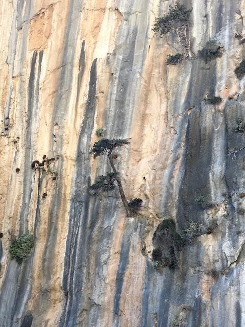 The Samariá Gorge has been a National Park in Crete since 1962 – a major tourist attraction of the island – and a World Biosphere Reserve. We travelled by bus from Chania to a height of 1,250 m at the northern entrance.The cool winds swirl around the pine trees at the top and a little shiver goes through you. We entered the National Park with lots of other eager hikers and started making our way down on the broad stone steps. You need to keep your eyes on the ground because the stones are uneven and very slippery from use so it is easy to slip over or sprain an ankle. We saw a hiker do exactly that but she was rescued and placed on a horse or mule ambulance to take her out of the park. It would be a long ride so … eyes on the ground for the most part but then stop and look up to this-