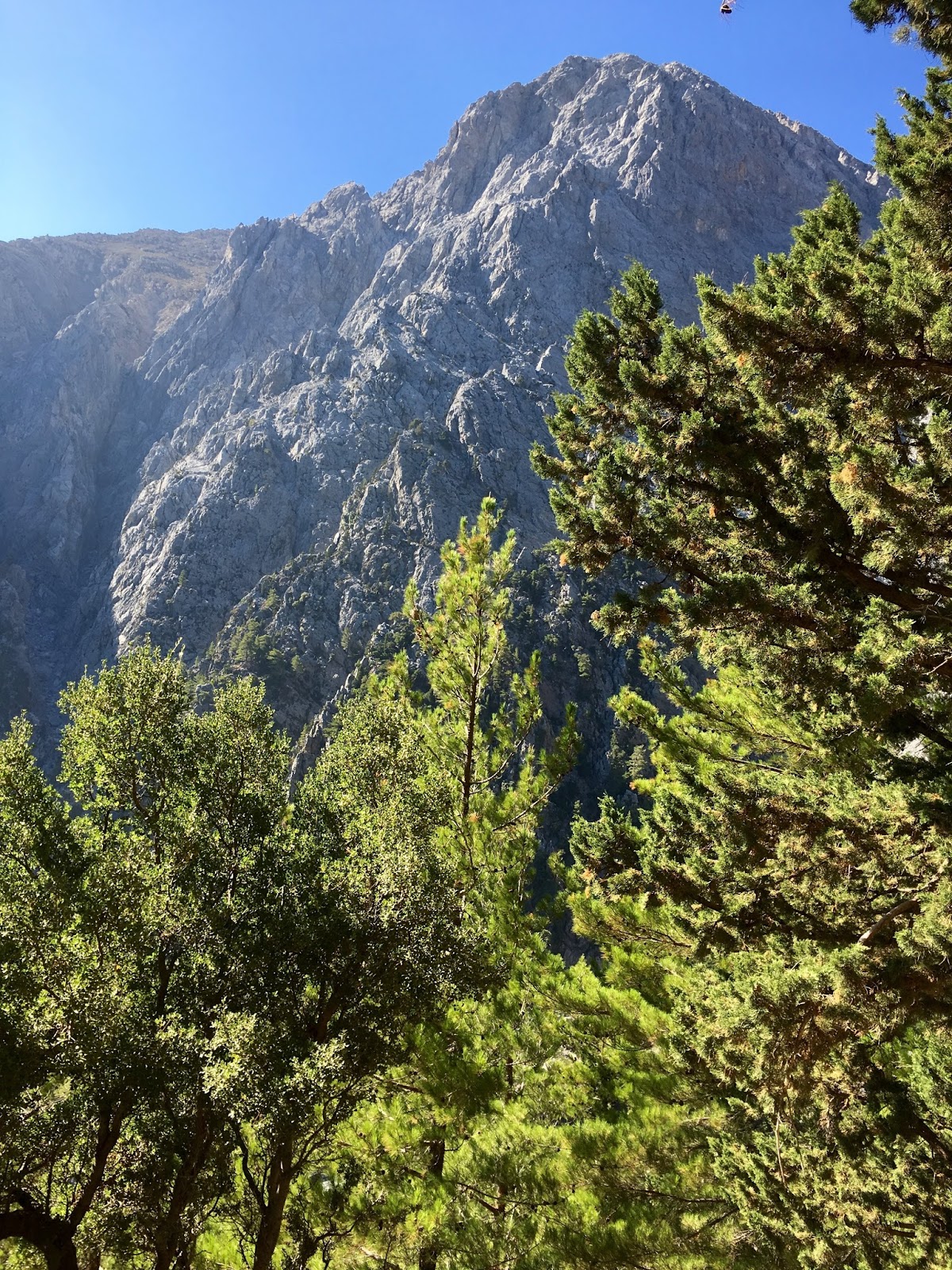 We walked down many steps, slipped on stones and fumbled our way over loose ones. The hike was through the pine trees, plane trees and tall cypresses. In parts it has shaded rest places. After some four hours of walking we were finally right in the depth of the gorge walking along the river bed which burbled with crystal clear water. We crossed bridges and walked along dry river beds, looked at the geological formations and saw the pressures on the earth’s shape right in front of our very eyes.