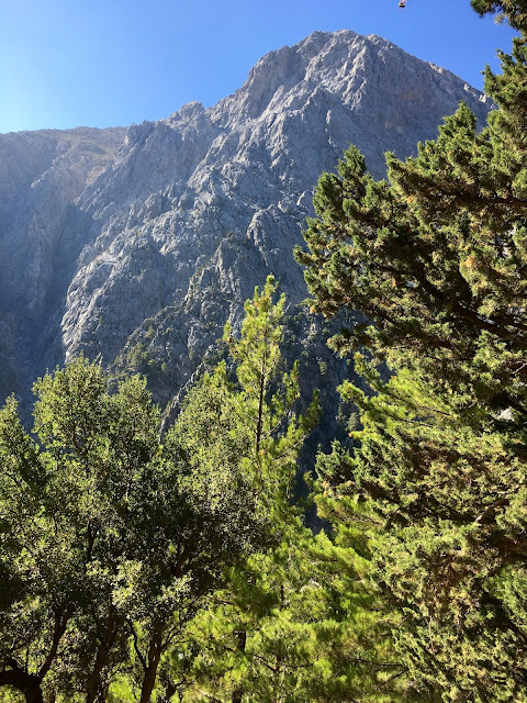 The Samariá Gorge has been a National Park in Crete since 1962 – a major tourist attraction of the island – and a World Biosphere Reserve. We travelled by bus from Chania to a height of 1,250 m at the northern entrance.The cool winds swirl around the pine trees at the top and a little shiver goes through you. We entered the National Park with lots of other eager hikers and started making our way down on the broad stone steps. You need to keep your eyes on the ground because the stones are uneven and very slippery from use so it is easy to slip over or sprain an ankle. We saw a hiker do exactly that but she was rescued and placed on a horse or mule ambulance to take her out of the park. It would be a long ride so … eyes on the ground for the most part but then stop and look up to this-