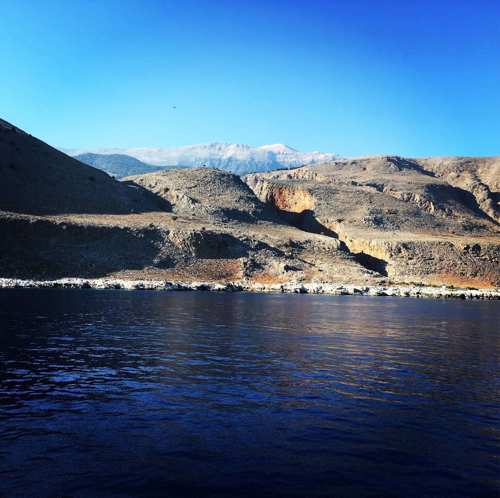 The most animated of all were the expressive goats that scrambled fearlessly on the precipices or lay sleeping during siesta time. The gorge was 13kms long and at the end of it was the village of Agia Roumeli which appeared completely isolated on the edge of the most beautiful bay. The water deep and soulful and very cooling and the scenery passionate. The sand black as the goat and burning hot.