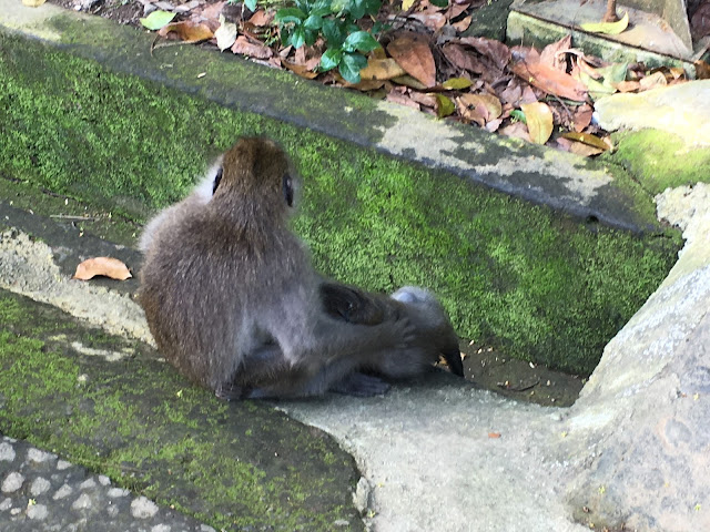 They are many troupes and they are quite territorial. They are hugely interactive with the tourists and some feed them bananas, others have them on their shoulder, but I just enjoyed watching them. As I was leaving there was a young male sitting in the path. He had a stone and a couple of seeds. He rolled the stone like a boy would roll marbles. He played with them and softened the seeds and occasionally popped them in his mouth. When he was shooed away by a cleaner he went back to collect his stone – marble and continued his play which was nothing short of a learned response. Just fascinating. I had watched them leap onto vertical tree trunks and climb to the top, do somersaults on the ground, groom one another carefully and have fun and games as well as cuddles with their young. I envied them that slightly mad free spirit so when I left the Forest and could not find a taxi I jumped onto the back of a Balinese motorbike and asked him to take me to the other side of town. I knew that was slightly mad and I was taking a bit of a risk but hell – why not. I have to say I was a little unnerved when he turned into some narrow back alley ways but actually it was a handy short cut which avoided the congestion of the main road. I felt I had meandered just like the monkeys.