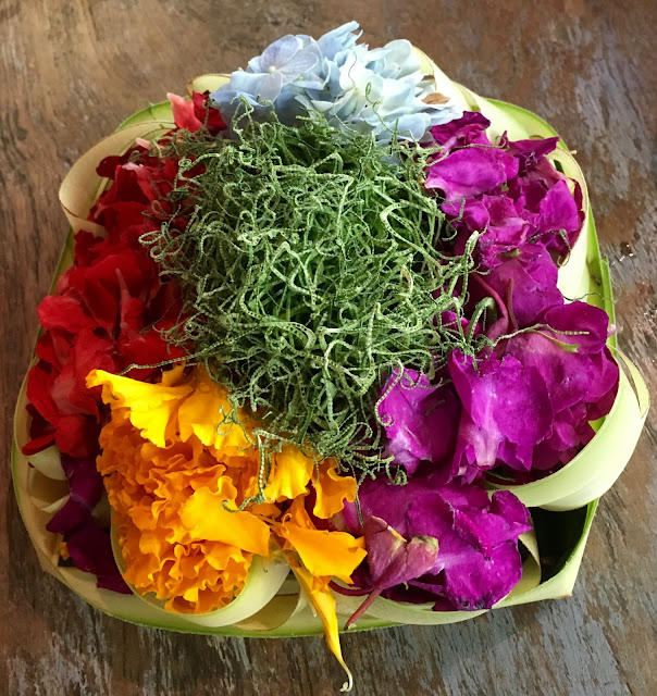 In the meantime Hinduism is mainstream though Bali is open to all religions. Every morning, hundreds of offerings are made and offered to the gods. The women spend hours cutting up the banana and palm leaves to size and making little receptacles in which they place the offerings. Here is one which is especially pretty but there are thousands made every day. They are placed in front of shrines, temples, statues, homes, places of business, fountains, ponds, hotels, shop fronts, restaurants and every conceivable nook and cranny which looks as if it might need one.