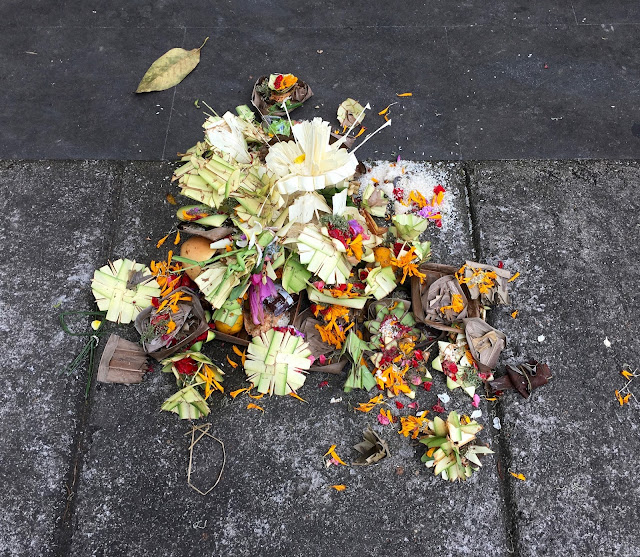 In the meantime Hinduism is mainstream though Bali is open to all religions. Every morning, hundreds of offerings are made and offered to the gods. The women spend hours cutting up the banana and palm leaves to size and making little receptacles in which they place the offerings. Here is one which is especially pretty but there are thousands made every day. They are placed in front of shrines, temples, statues, homes, places of business, fountains, ponds, hotels, shop fronts, restaurants and every conceivable nook and cranny which looks as if it might need one.