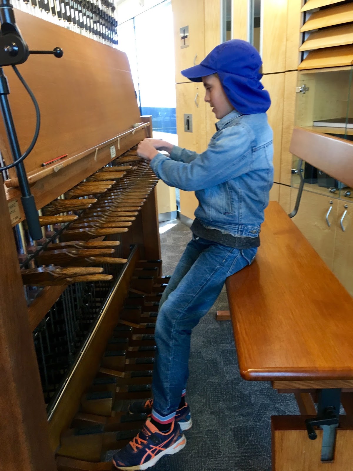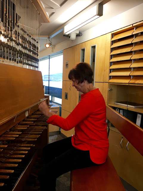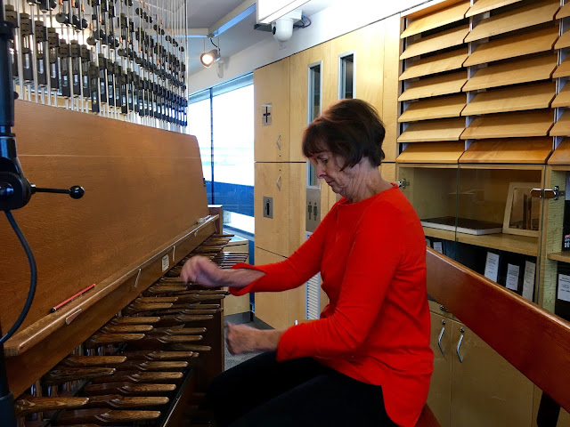 The keyboard has wooden batons and pedals which are hit by the hand which is held in a fist. So you play a lot with your last finger and use your feet for the pedals. The little boy was delighted to have a go but the best was being given a private recital by Lyn who played a small piece she had composed herself. It is an energetic and demanding process and she comes to practice three times a week and gives recitals from time to time. She had seen an advert in the paper about it and was dubious about being able to do it, but soon realised she had all the necessary skills. Now she trains young carillonists.