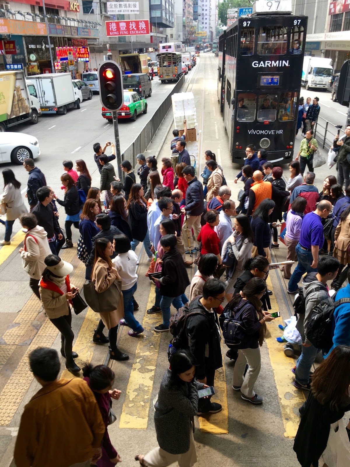 Our trip to Hong Kong comes in a busy month so there wasn’t much time for planning. Packing late one night we both went on instinct. HK is usually hot and humid so I packed skimpy tops and summer dresses. Hubby wasn’t sure he even packed his suit trousers so the state of unpreparedness was marked. We landed in a misty HK with cool temperatures and everyone wandering around in their boots, parkas and Burberry scarfs. We walked out this morning in flip flops and T-shirts and fulfilled the role of “Spot the Tourist” ably!