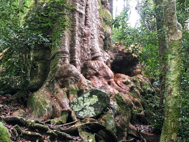 We set off the next morning on a 10 kms walk. The rain had abated for a while but we took our rain jackets, tucked our trousers into our socks, put on our walking boots and headed off. The paths were wet and you might think our ability to see was reduced. Not so- the massive trees that line the paths had trunks whose colours popped out at us. Some of them even held hands. Trumpet fungi and orange balls hid here and there and the leaves glistened clean and bright in the emerging sunlight.