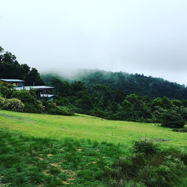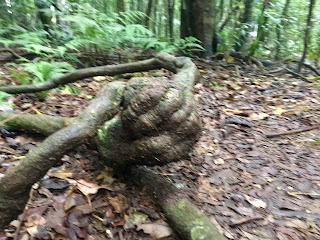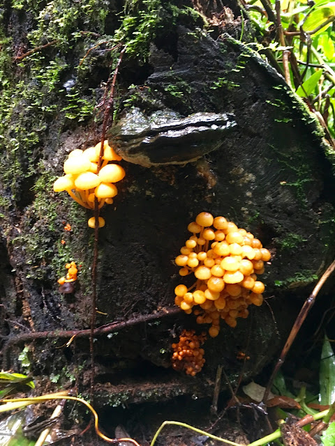 We set off the next morning on a 10 kms walk. The rain had abated for a while but we took our rain jackets, tucked our trousers into our socks, put on our walking boots and headed off. The paths were wet and you might think our ability to see was reduced. Not so- the massive trees that line the paths had trunks whose colours popped out at us. Some of them even held hands. Trumpet fungi and orange balls hid here and there and the leaves glistened clean and bright in the emerging sunlight.