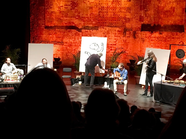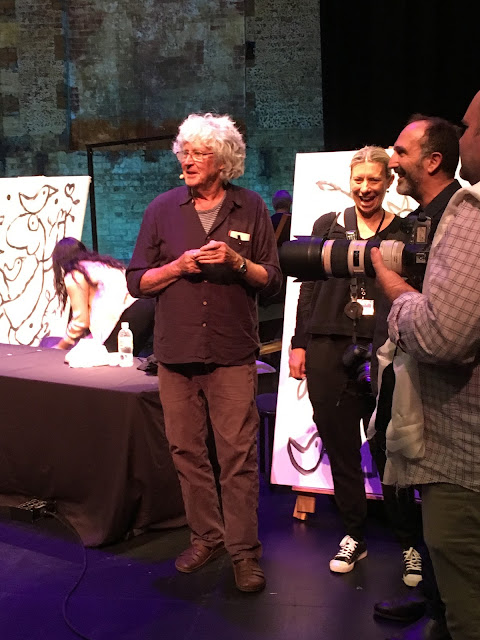 The other guest on stage was Michael Leunig, Australia’s celebrated cartoonist, http://www.leunig.com.au/about/biography with his shock of white hair and his paintbrush. The story begins some fifteen years ago when Tenzin met Leunig busking in Melbourne. They have been firm friends ever since and last night was a coming together of their friendship and creativity in aid of Tibet.