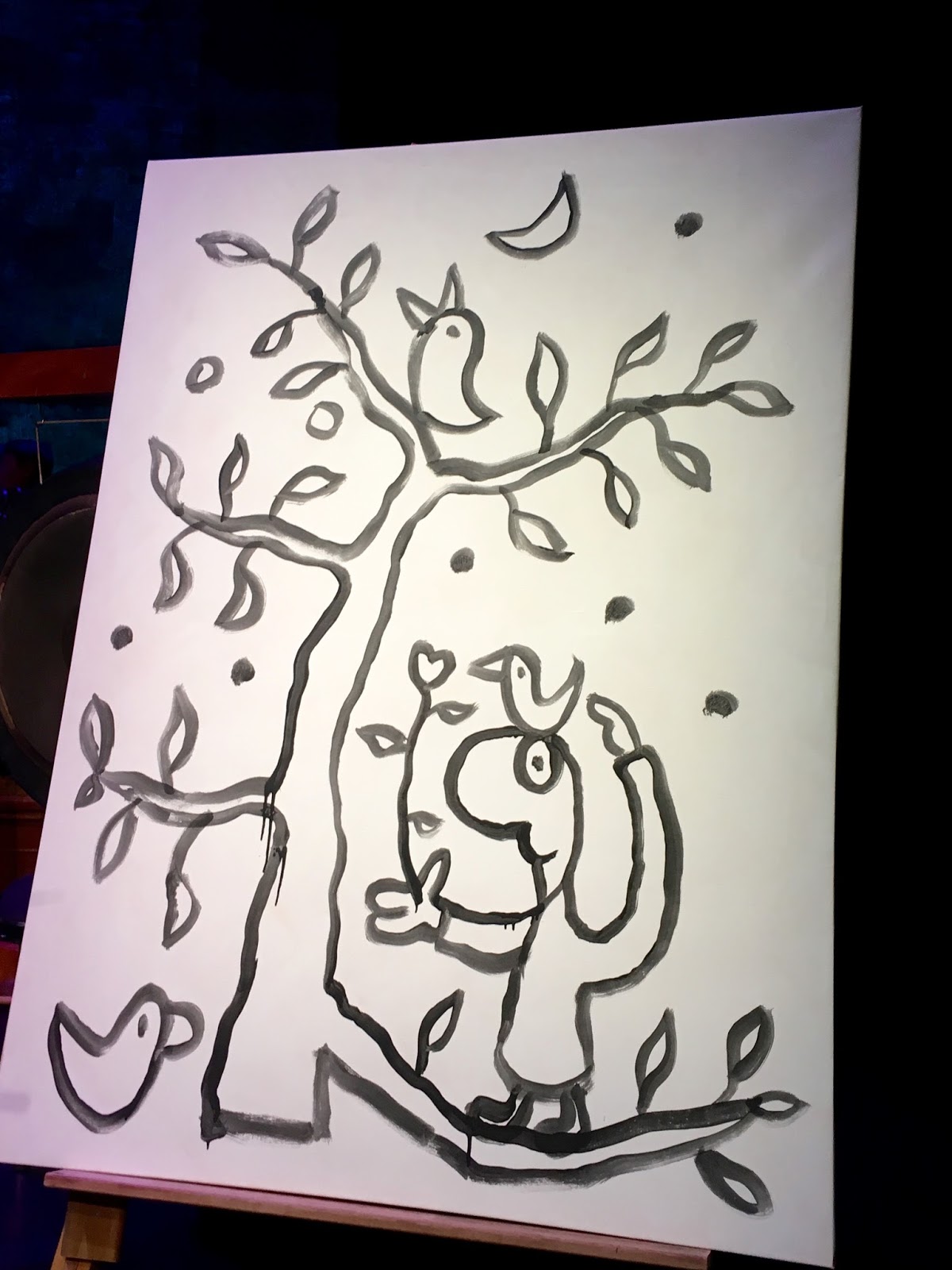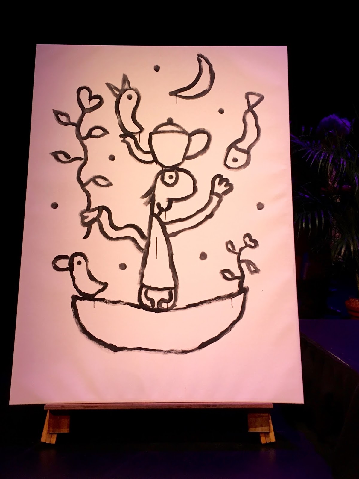 Music and song accompanied Leunig’s doodles and drawings.The Theme was “Nurturing the Earth” and it was a feast for the senses and the soul. In the course of the concert he created five canvases of his familiar and much loved happy humans who dance with light and laughter, love and lightness. His strokes were assured and his explanations humble, this is what he knows how to do, and he has been doing it for years, and people respond to them, and appreciate the sentiments expressed in each one.