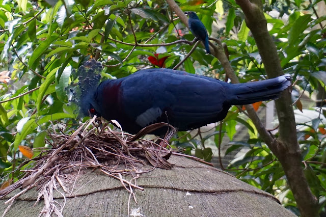This one here is the Victoria Crowned Pigeon, looking a little regal like Queen Victoria perhaps, with her sombre blues, a feathered crown with white ends – like a tiara no less.